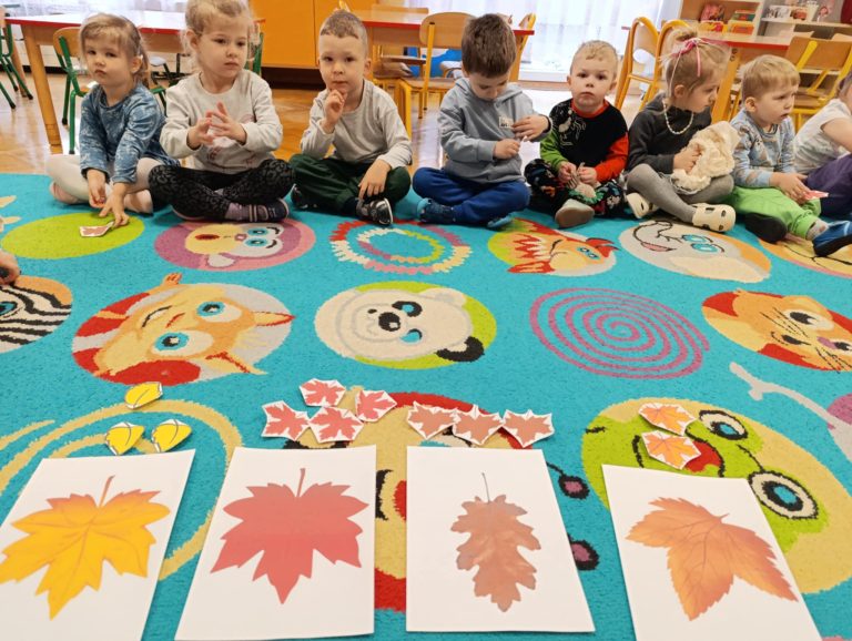 W naszym przedszkolu odkrywaliśmy kolory jesieni, które kryją się w liściach. Dzieci przyporządkowywały listki do odpowiednich