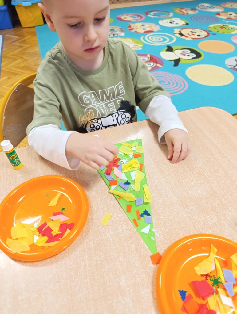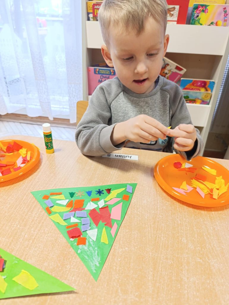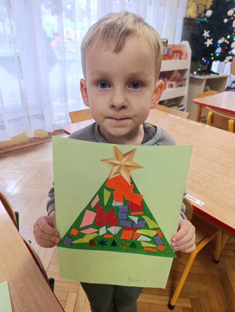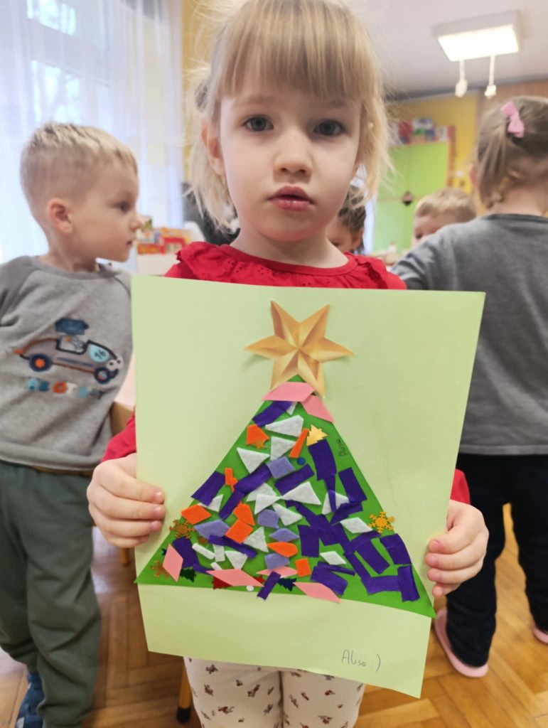 Podczas dzisiejszych zajęć w naszym przedszkolu dzieci z radością wyklejały i dekorowały własne choinki. Każde dziecko samodzielnie ozdabiało swoją pracę, rozwijając kreatywność, sprawność manualną i poczucie estetyki. Zajęcia były doskonałą okazją do rozmów o świątecznych tradycjach i nadchodzących świętach. Przedszkolaki z dumą prezentowały swoje choinki, które różniły się kolorami i pomysłami. Panowała radosna, świąteczna atmosfera pełna uśmiechów i twórczej zabawy!