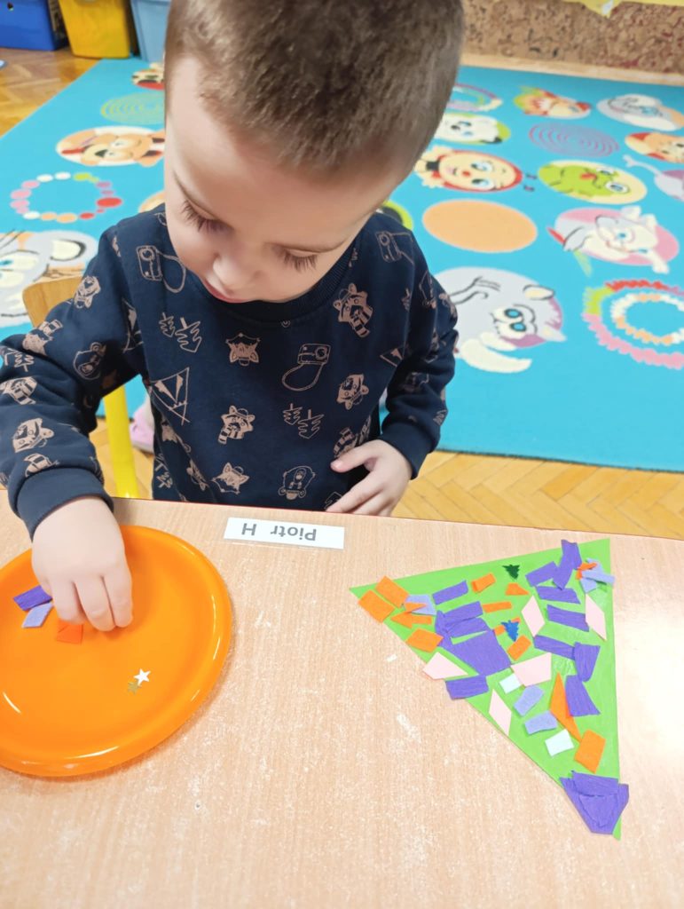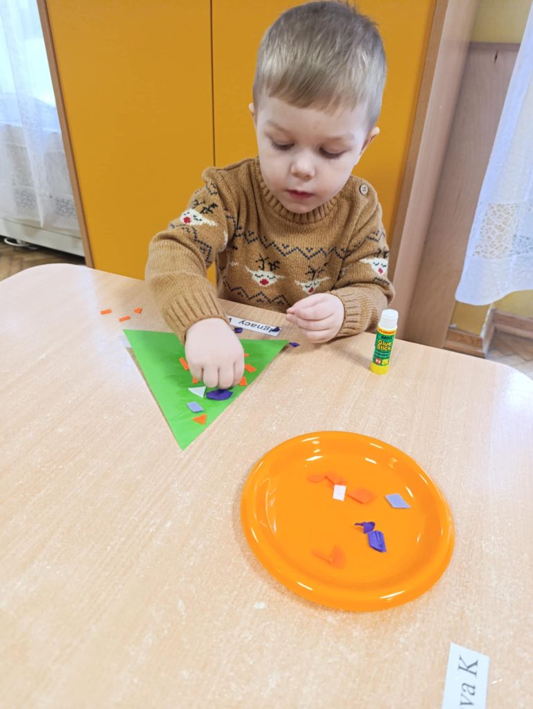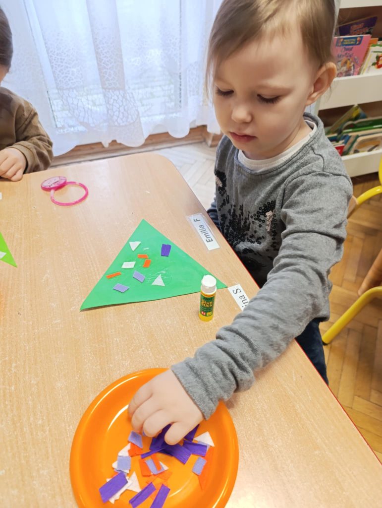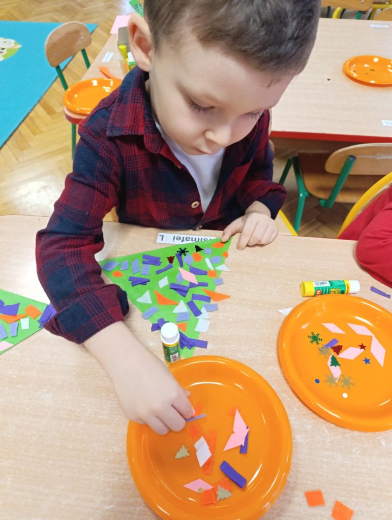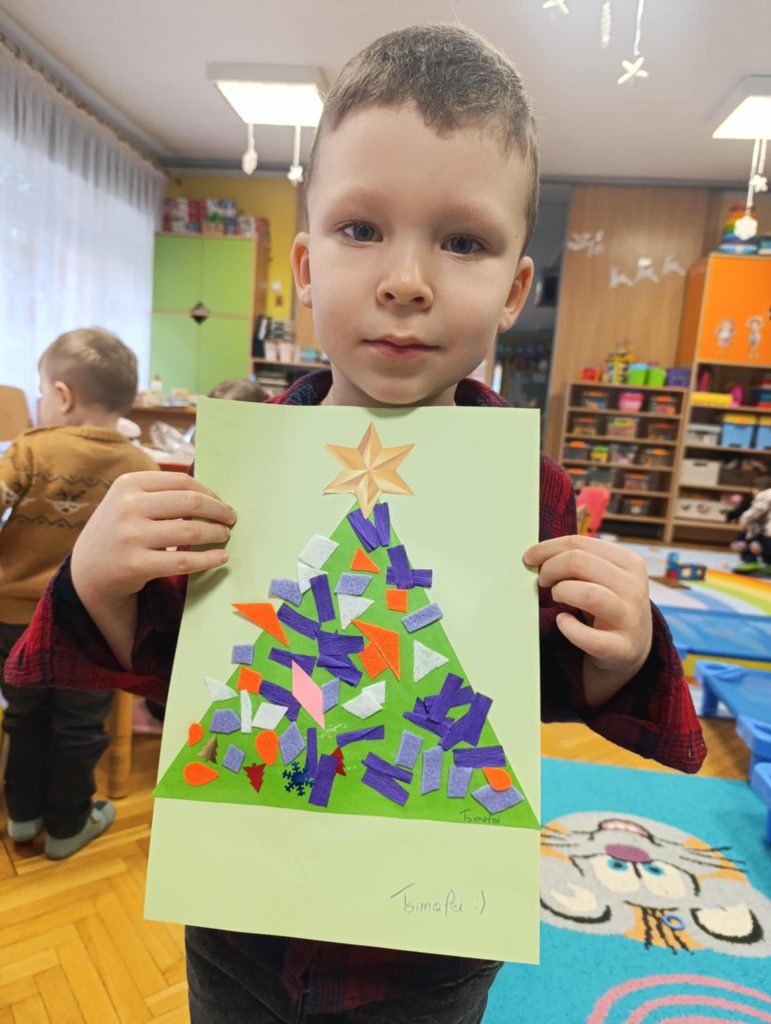 Podczas dzisiejszych zajęć w naszym przedszkolu dzieci z radością wyklejały i dekorowały własne choinki. Każde dziecko samodzielnie ozdabiało swoją pracę, rozwijając kreatywność, sprawność manualną i poczucie estetyki. Zajęcia były doskonałą okazją do rozmów o świątecznych tradycjach i nadchodzących świętach. Przedszkolaki z dumą prezentowały swoje choinki, które różniły się kolorami i pomysłami. Panowała radosna, świąteczna atmosfera pełna uśmiechów i twórczej zabawy!