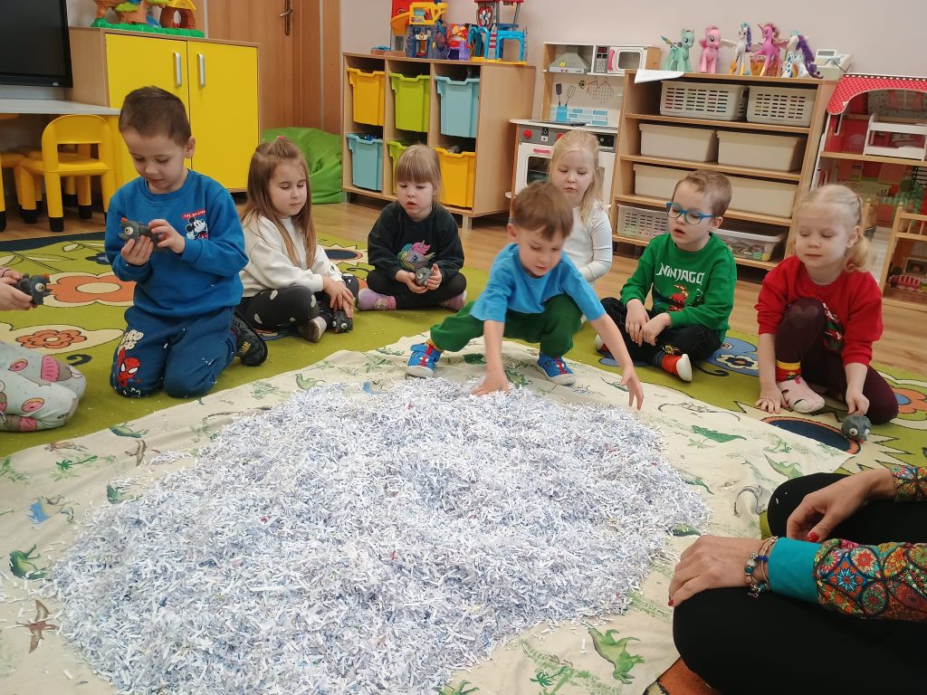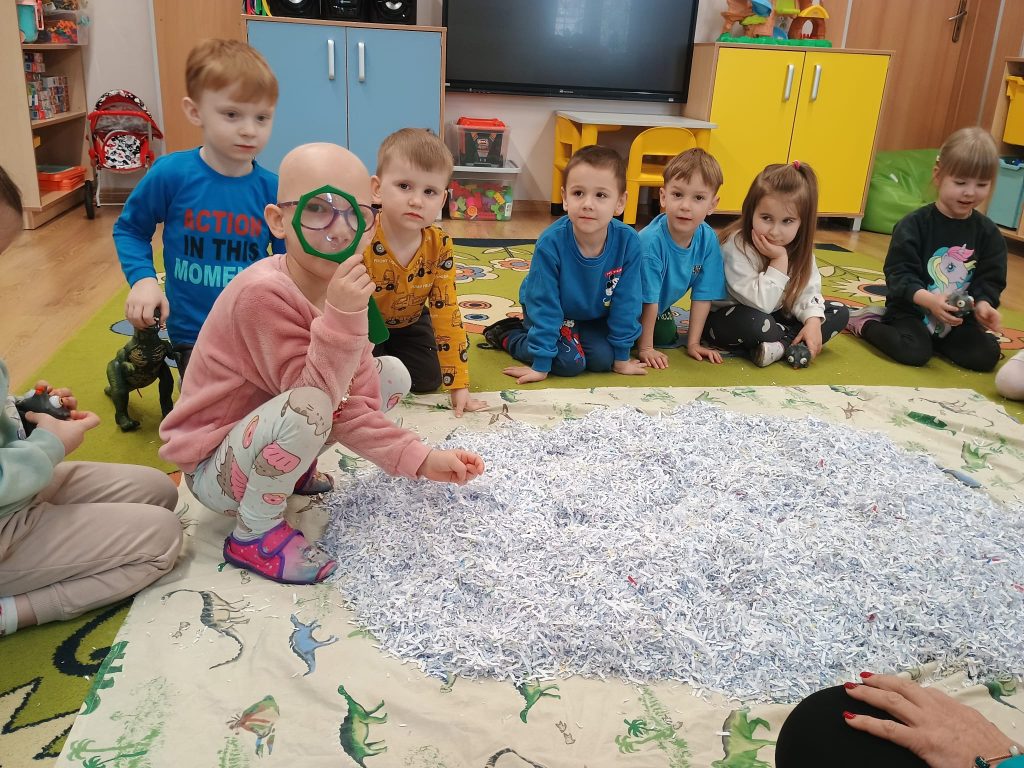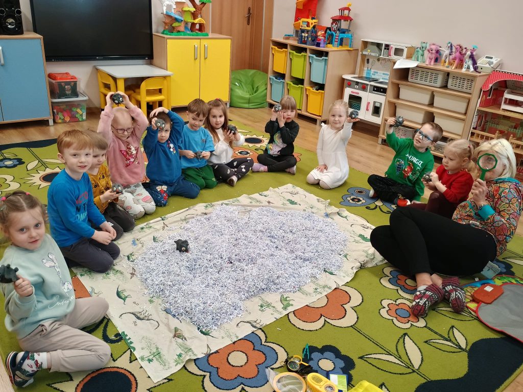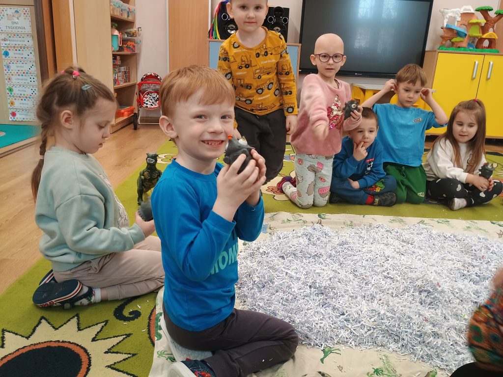 Pani Marzanna przeniosła Dzieci do epoki sprzed milionów lat. Mali odkrywcy z lupą w ręku poszukiwali pradawnych stworzeń – dinozaurów.