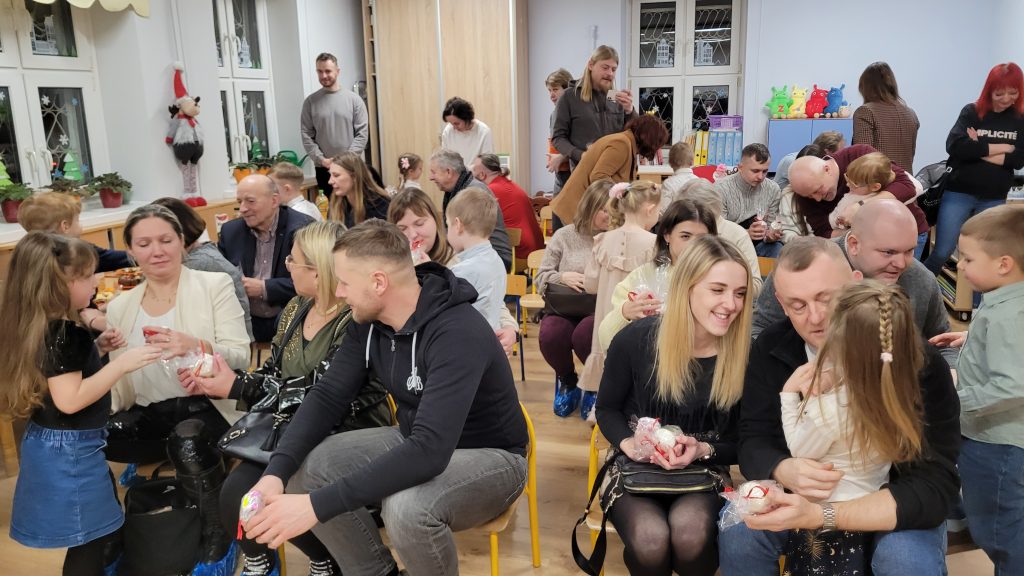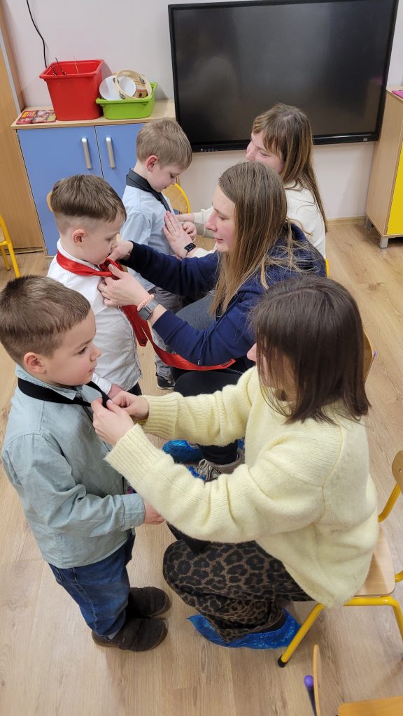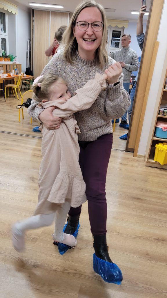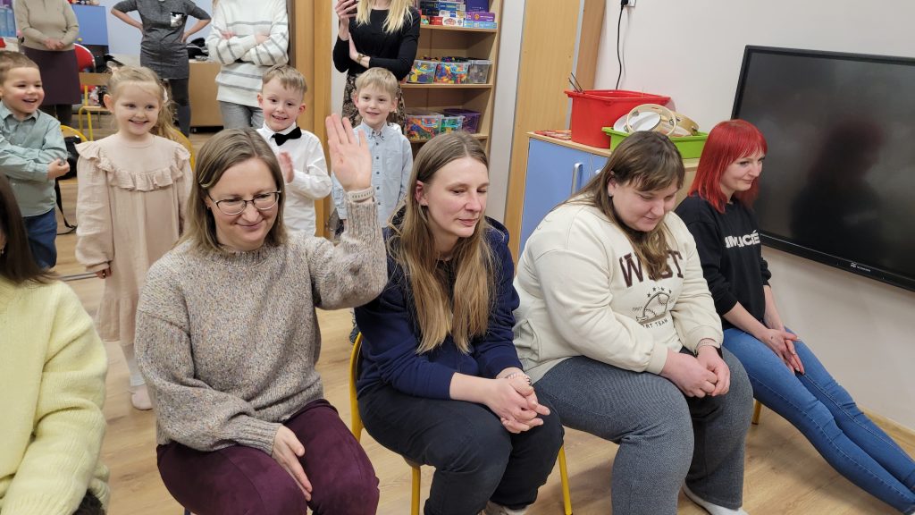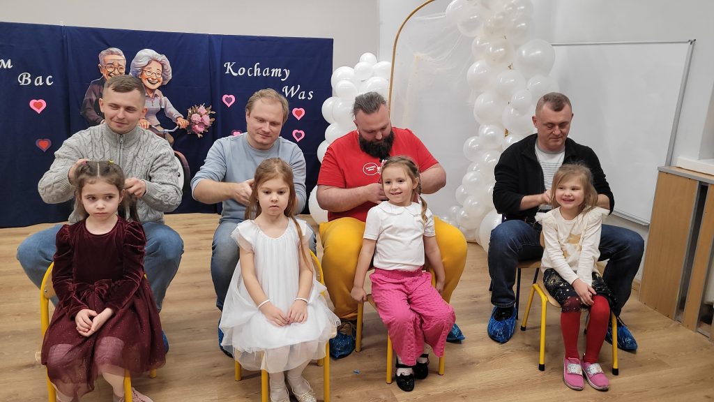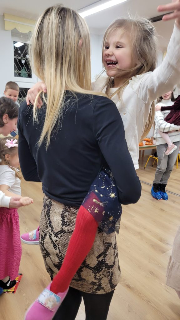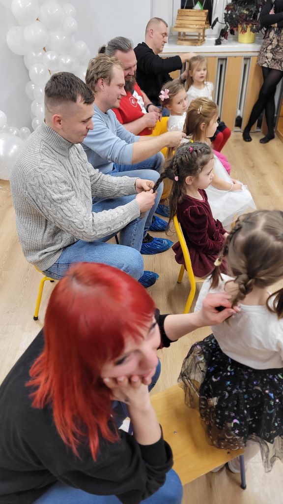 Po występach wszyscy zostali zaproszeni na słodki poczęstunek, który z ogromnym zaangażowaniem przygotowali rodzice. Kolejnym punktem programu były wspólne konkursy i zabawy, które dostarczyły mnóstwo śmiechu i pozytywnych emocji – taniec na gazecie, wiązanie krawatów oraz robienie warkoczy okazały się prawdziwym hitem spotkania.