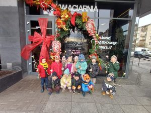 Przedszkolaki odwiedziły Kwiaciarnię Powód do uśmiechu. Pani w kwiaciarni pokazała najpiękniejsze kwiaty w stroikach świątecznych, opowiedziała o bukietach oraz obdarowała przedszkolaki kwiatkiem.