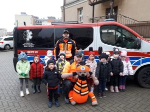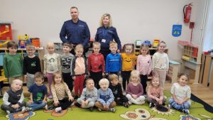 Do naszej grupy zawitali Policjanci z I Komisariatu. Państwo policjanci przypomnieli podstawowe zasady zachowania się podczas przechodzenia przez jezdnię. Następnie wytłumaczyli, jak należy zachować się w kontaktach z obcymi osobami, jak dbać o bezpieczeństwo własne oraz do kogo zwracać się o pomoc w sytuacjach zagrożenia.