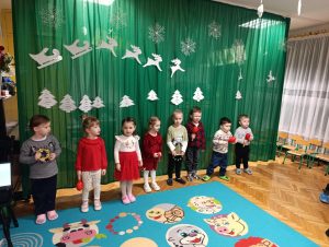 15 grudnia 2025 roku do naszego przedszkola przyjechał teatr Arte-Muza ze świątecznym spektaklem pt. „List do Mikołaja”.Aktorzy zachwycili dzieci ciekawą grą aktorską, pięknym śpiewem oraz grą na instrumentach muzycznych.Przedszkolaki z radością brały udział we wspólnych zabawach i interakcjach z artystami.Spektakl wprowadził wszystkich w magiczny, świąteczny nastrój.