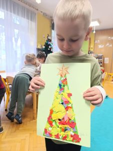 Podczas dzisiejszych zajęć w naszym przedszkolu dzieci z radością wyklejały i dekorowały własne choinki. Każde dziecko samodzielnie ozdabiało swoją pracę, rozwijając kreatywność, sprawność manualną i poczucie estetyki. Zajęcia były doskonałą okazją do rozmów o świątecznych tradycjach i nadchodzących świętach. Przedszkolaki z dumą prezentowały swoje choinki, które różniły się kolorami i pomysłami.