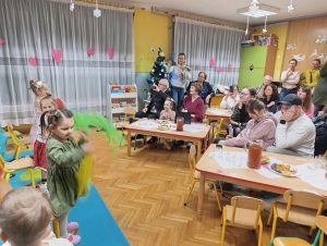Z okazji Dnia Babci i Dziadka w naszym przedszkolu odbyło się radosne i pełne ciepła spotkanie. Dzieci zaprezentowały przygotowany występ, podczas którego śpiewały piosenki i tańczyły, sprawiając swoim dziadkom wiele radości. Po części artystycznej wszyscy zostali zaproszeni na wspólny poczęstunek, który był okazją do rozmów i miłego spędzenia czasu. Następnie