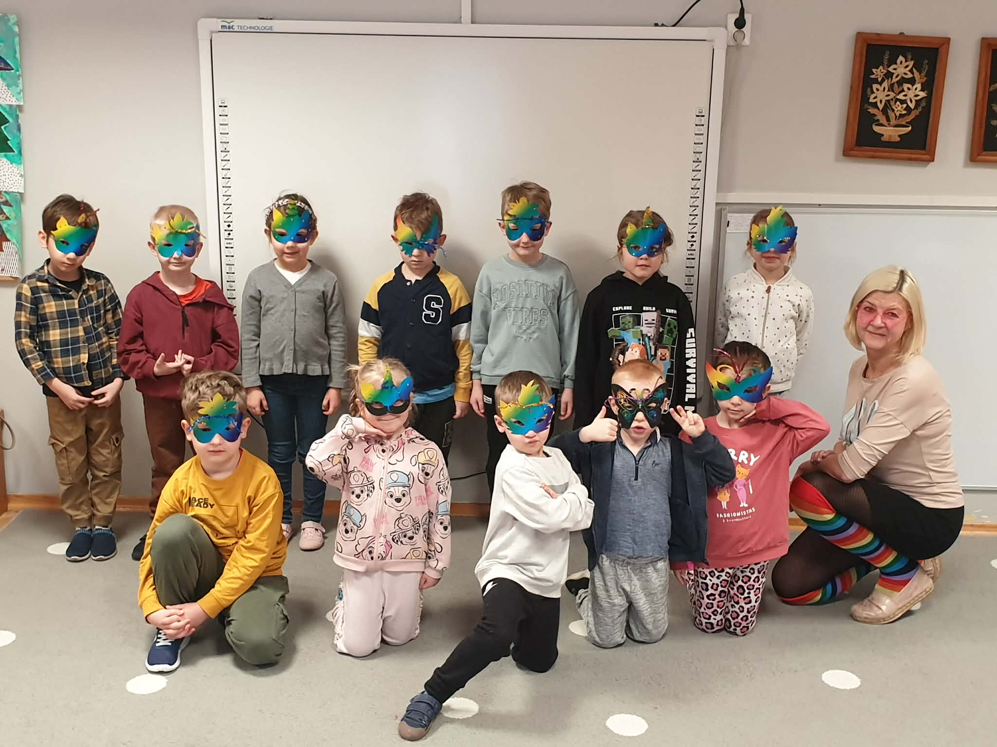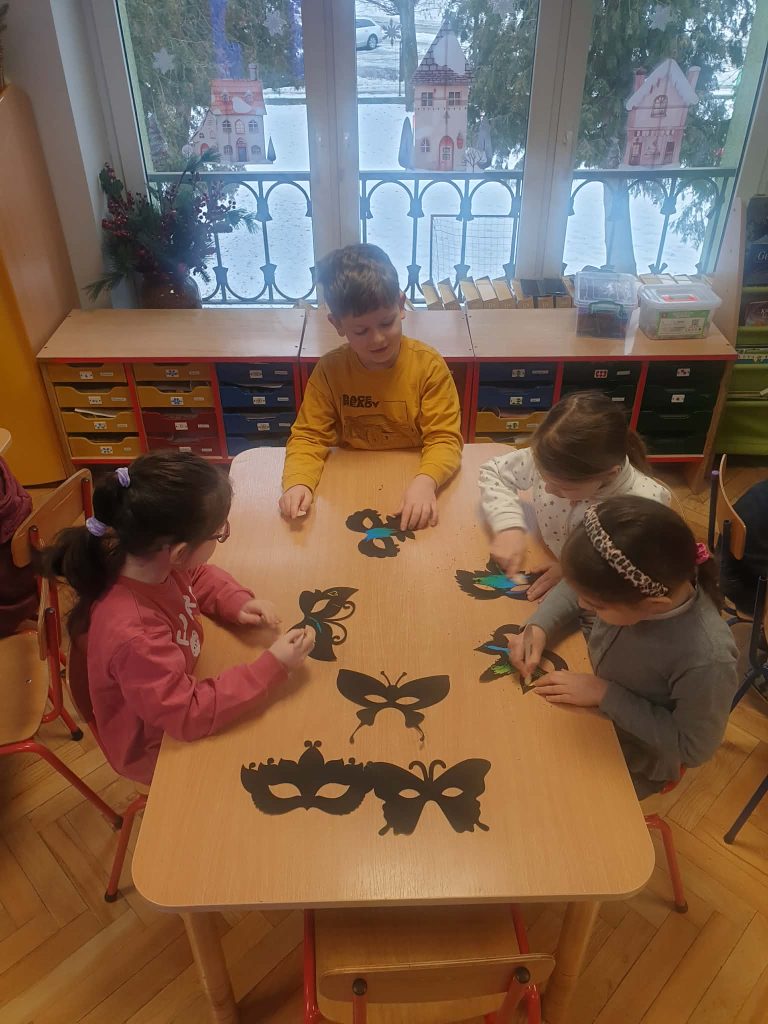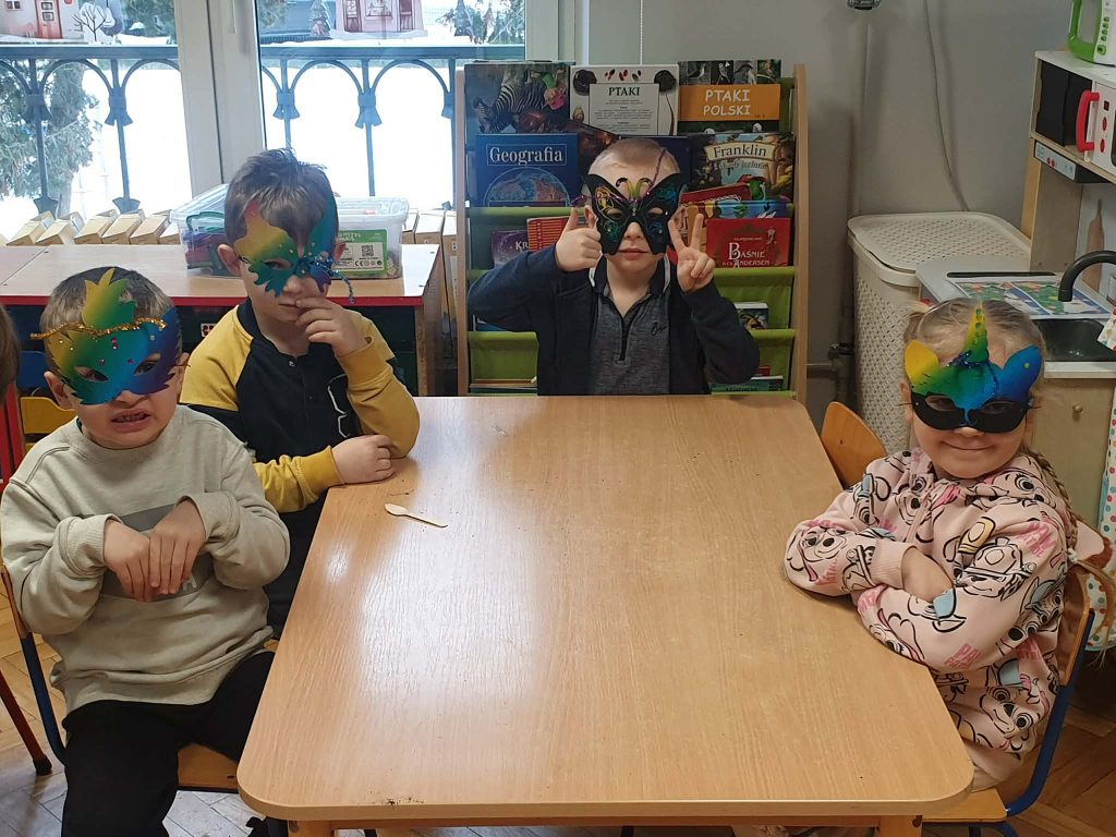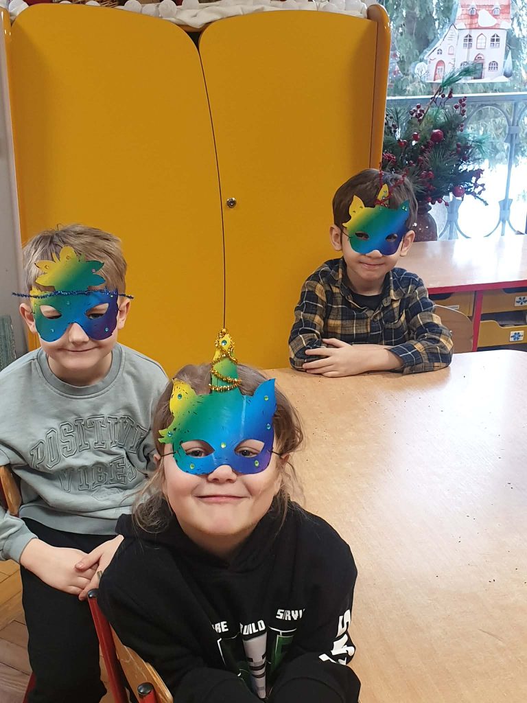 Na zakończenie każdy uczestnik wykonał własną karnawałową maskę, pięknie ją ozdabiając. Zajęcia dostarczyły dzieciom wiele radości, sprzyjały integracji grupy oraz rozwijaniu kreatywności i umiejętności społecznych.
