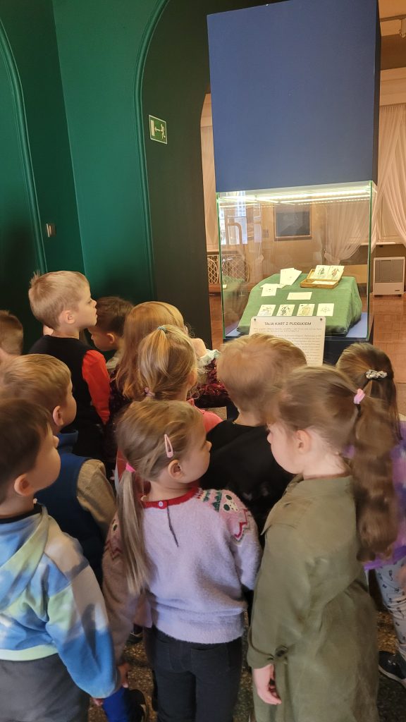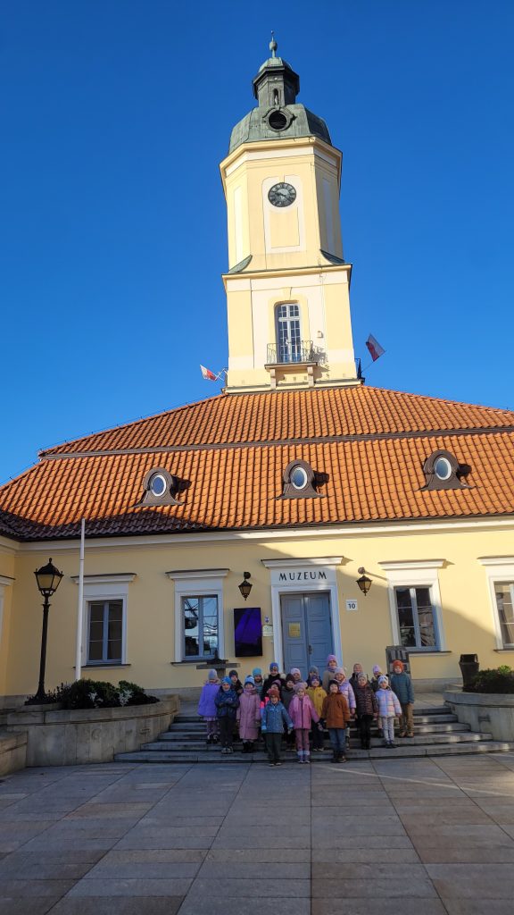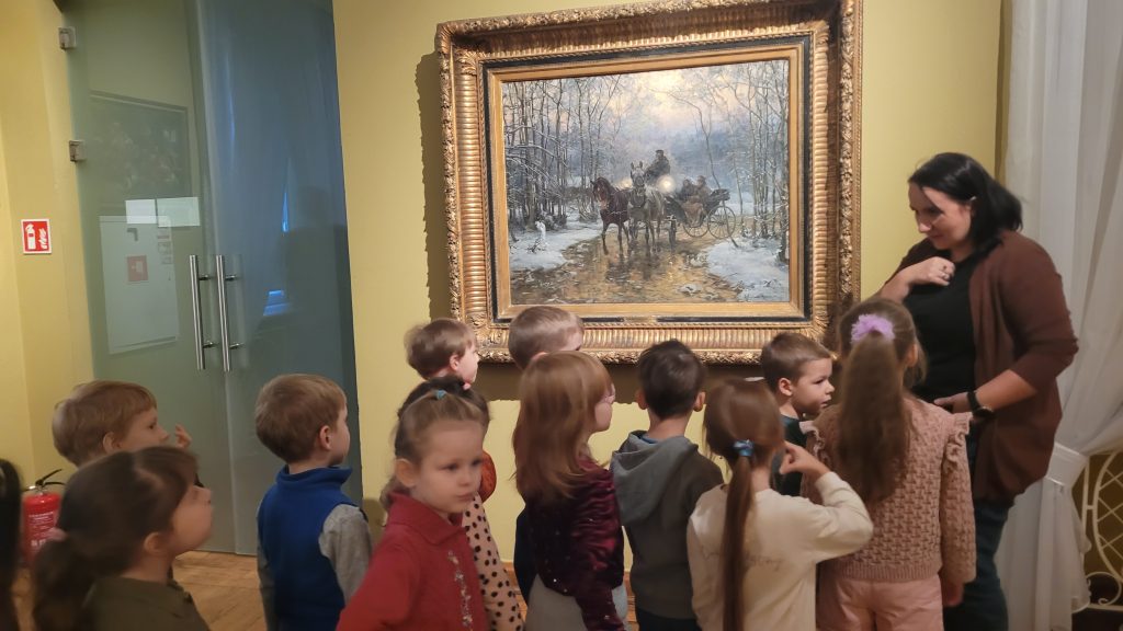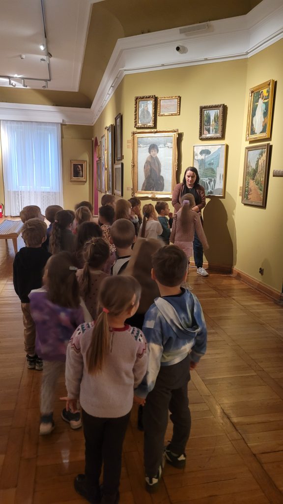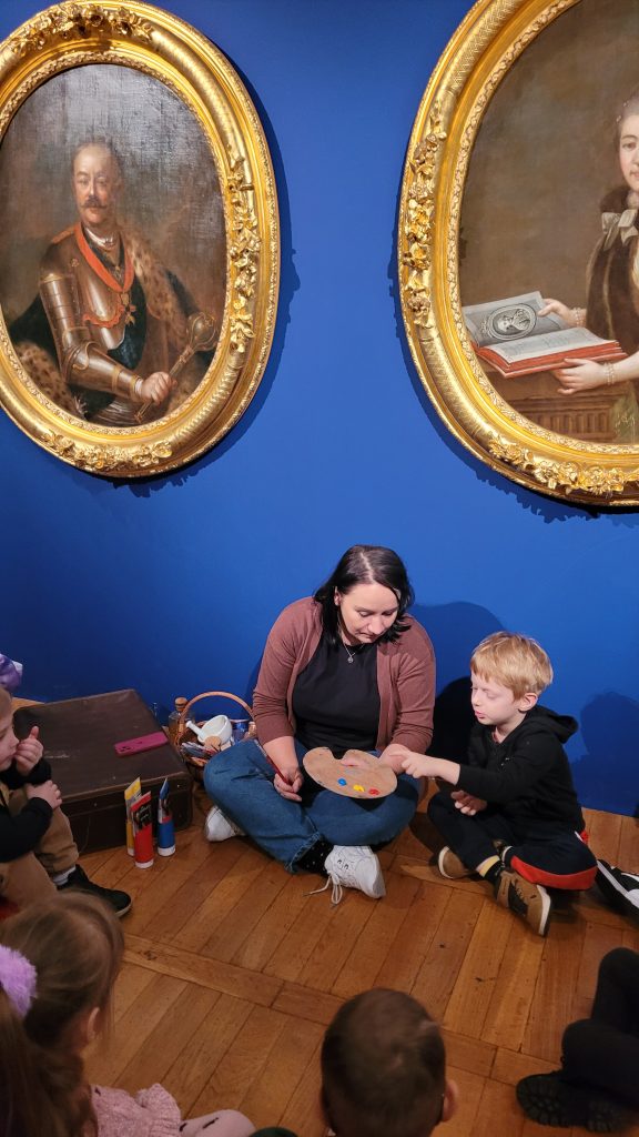 Muzeum Podlaskie w Białymstoku mieszczące się w Ratuszu Miejskim posiada ciekawe propozycje zajęć interaktywnych przygotowane dla różnych grup wiekowych. Przedszkolaki z grupy IV wybrały się na zajęcia poświęcone kolorom. W otoczeniu obrazów poznawały tajniki kolorów podstawowych i powstawania ich barw pochodnych. Szukały odpowiedzi na pytania czy kolory mają temperaturę? Co sprawia, że obrazy wydają nam się wesołe albo smutne? Na zajęciach odbyły podróż w tajemniczą i piękną krainę kolorów. Poznały różne barwy i odszukały je na obrazach. Następnie podczas warsztatów plastycznych same stworzyły barwne prace.
