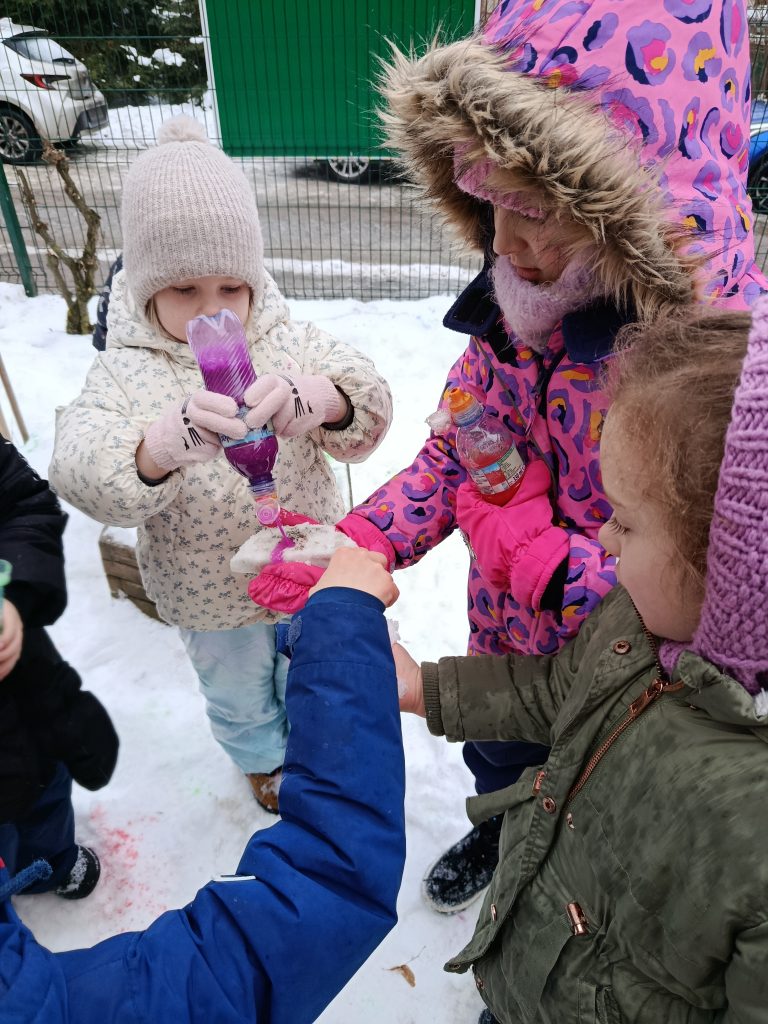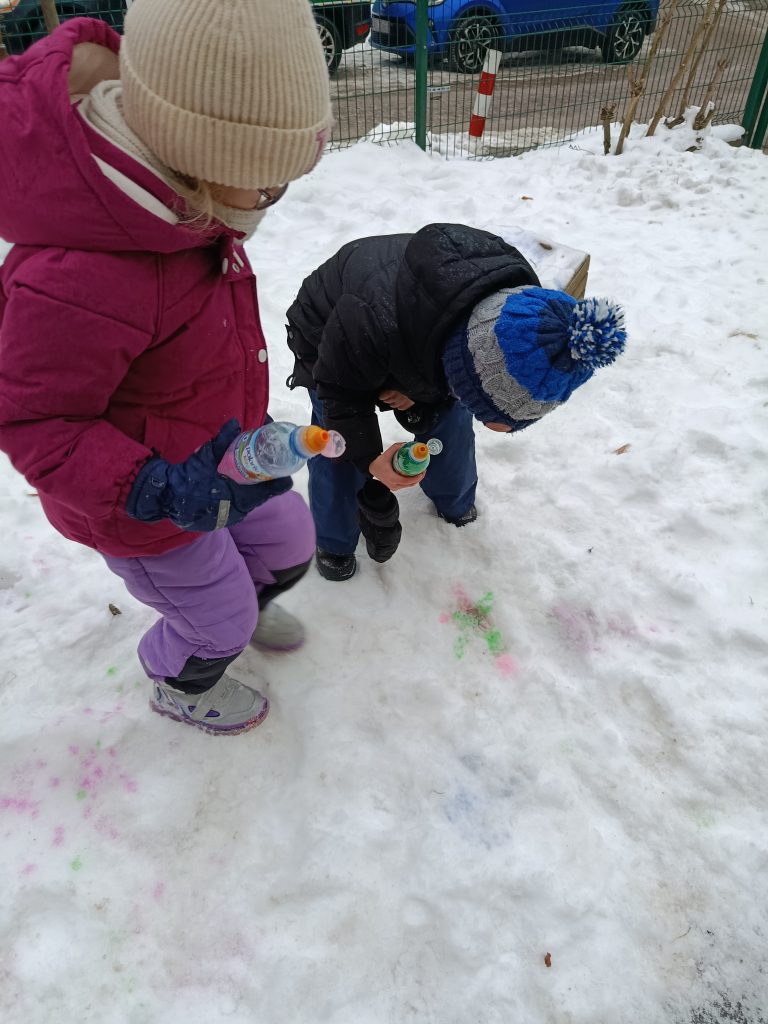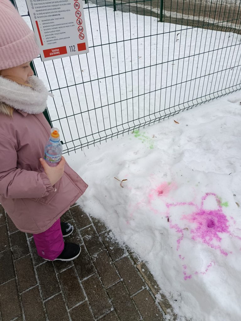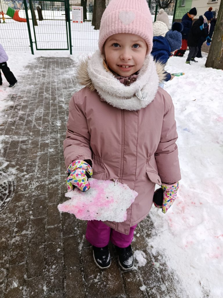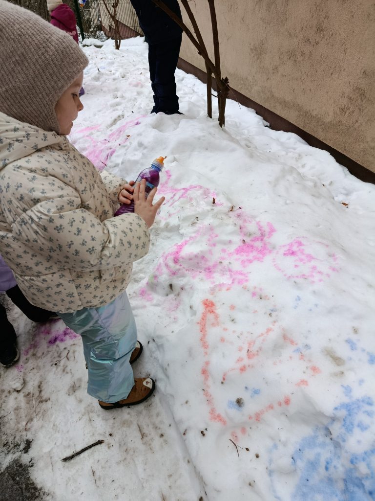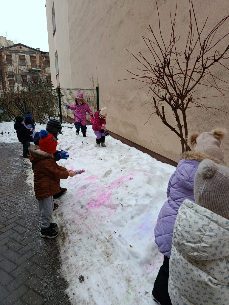 Dziś nasze podwórko zamieniło się w prawdziwą, zimową galerię sztuki! ❄️🎨 Podczas zajęć na świeżym powietrzu dzieci malowały śnieg, używając kolorowych farb. To niezwykłe doświadczenie pobudziło ich wyobraźnię, zachęciło do eksperymentowania z kolorami i pozwoliło twórczo wykorzystać zimową aurę. Zabawa była pełna radości, śmiechu i spontanicznej ekspresji, a przy okazji wspierała rozwój motoryki małej oraz wrażliwości artystycznej. Nauka przez zabawę na świeżym powietrzu to dla nas sama przyjemność!