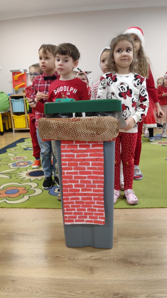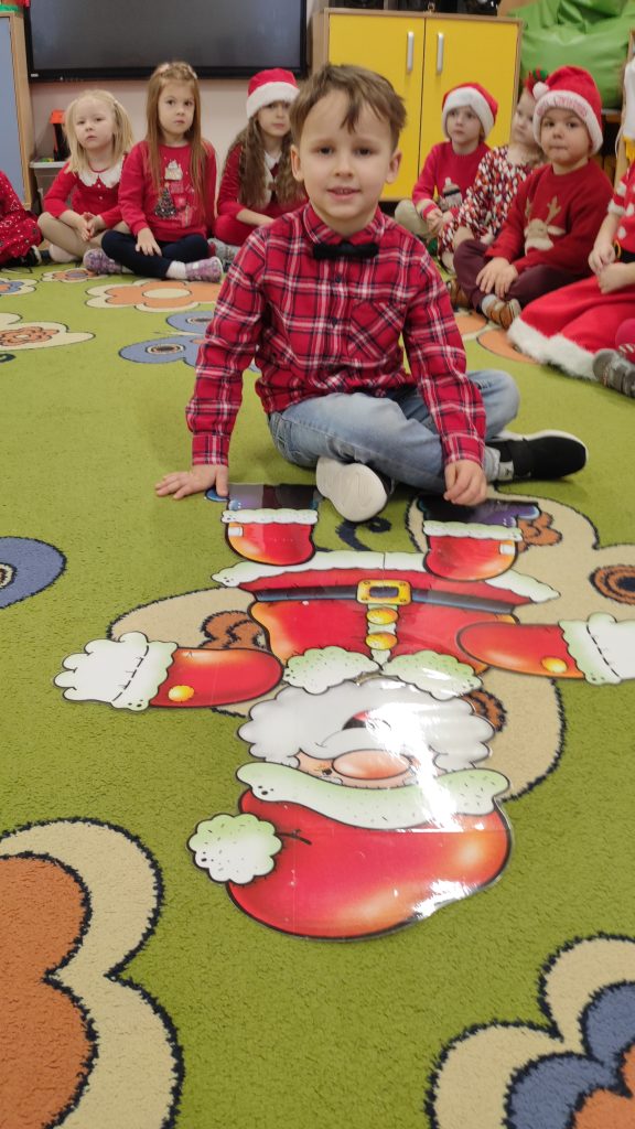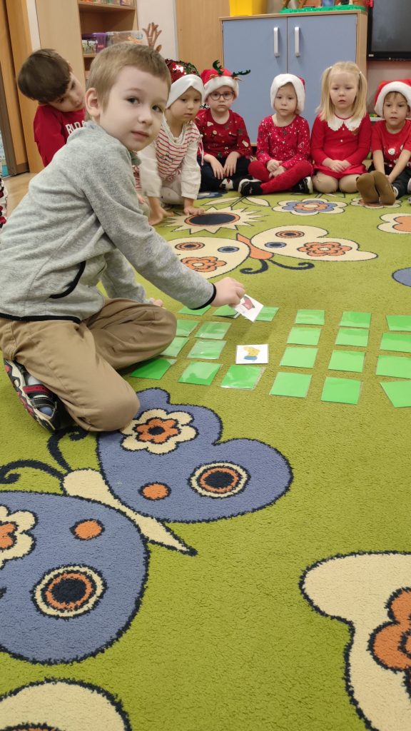 Następnie ćwiczyliśmy celność w zabawie „Traf do komina”, a w grze memo dzieci doskonaliły pamięć, odkrywając pary zimowych obrazków. W zabawie „szybki prezent” liczył się refleks i spostrzegawczość, co dostarczyło nam mnóstwo emocji. Nie zabrakło także zabaw z muzyką, przy których wszyscy chętnie tańczyli i śpiewali.