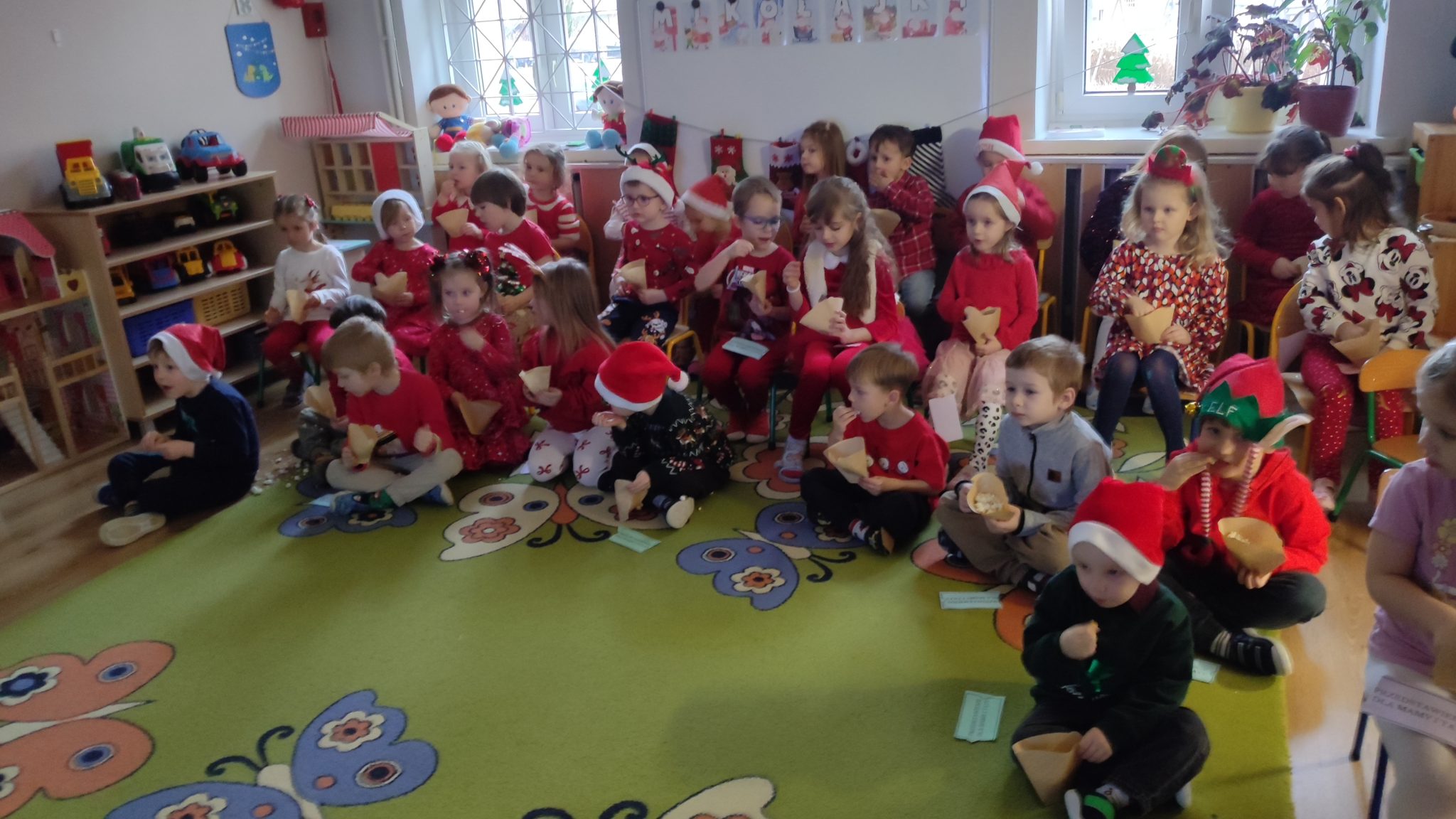 Zwieńczeniem tego radosnego dnia było kino w przedszkolu, gdzie dzieci obejrzały świąteczną bajkę, odpoczywając po pełnym wrażeń poranku.