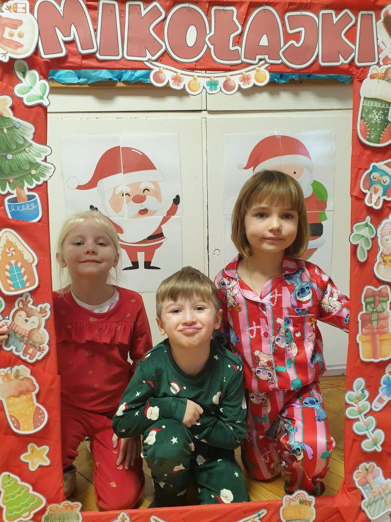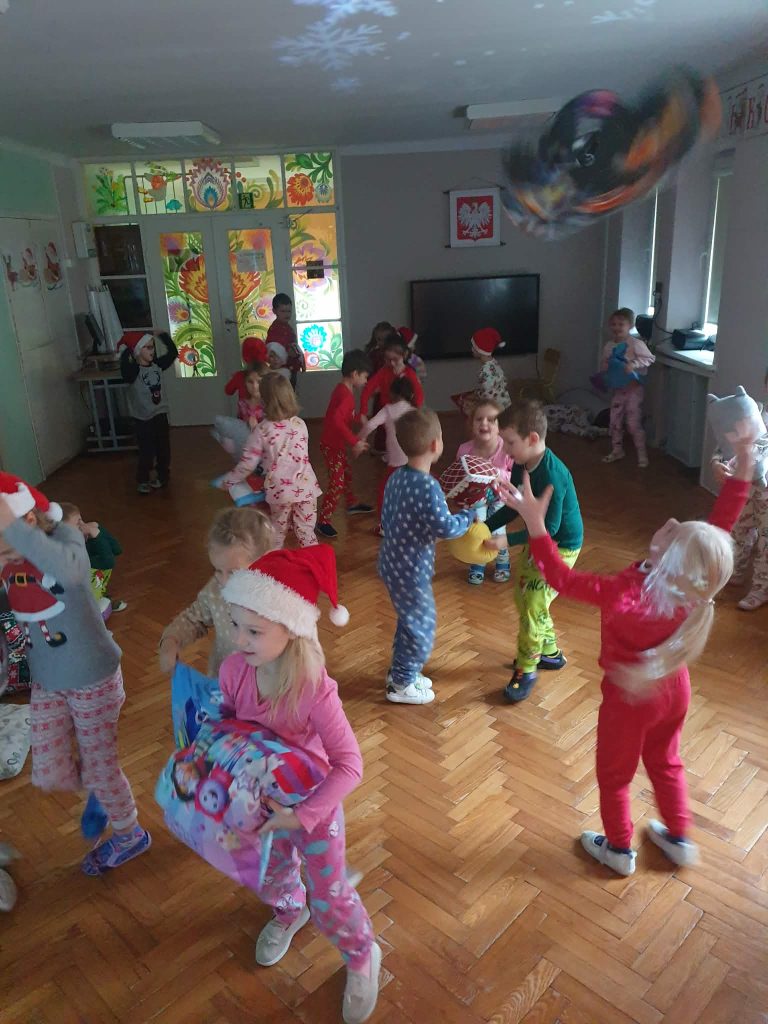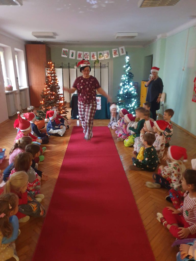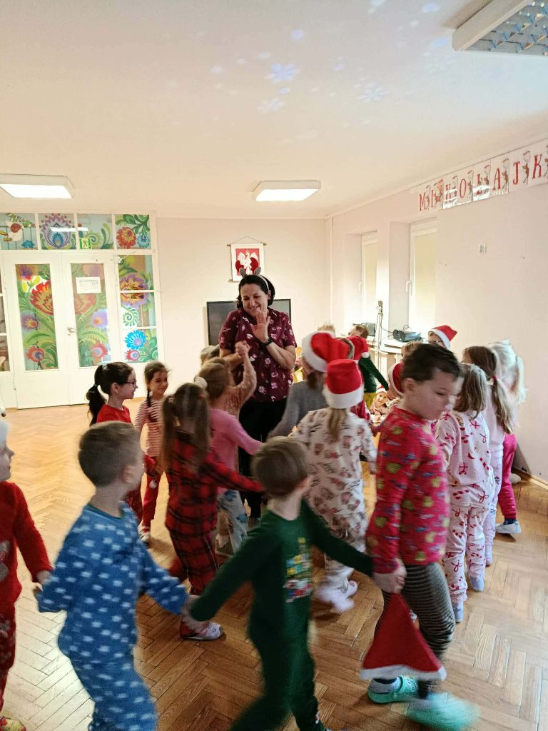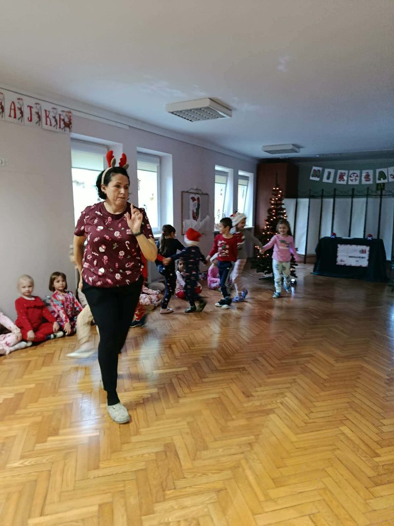 W naszej grupie i grupie V odbyły się w piątek (05.12.2025r.) wyjątkowe Mikołajki w formie radosnego piżama party. Dzieci przyszły do przedszkola w swoich ulubionych świątecznych piżamkach, przynosząc miękkie poduszki, które tworzyły przytulną, świąteczną atmosferę. Wspólne tańce wywołały mnóstwo śmiechu i energii, a muzyka szybko porwała wszystkich do zabawy. Dużym wydarzeniem był również podczas którego dzieci dumnie prezentowały swoje kolorowe stroje- piżamy. Nie zabrakło także kreatywnych zabaw ruchowych i integracyjnych, które umiliły ten wyjątkowy dzień. Piżamkowe Mikołajki przyniosły nam wiele radości i niezapomnianych wrażeń. To była naprawdę magiczna i pełna uśmiechów chwila w naszym przedszkolu!