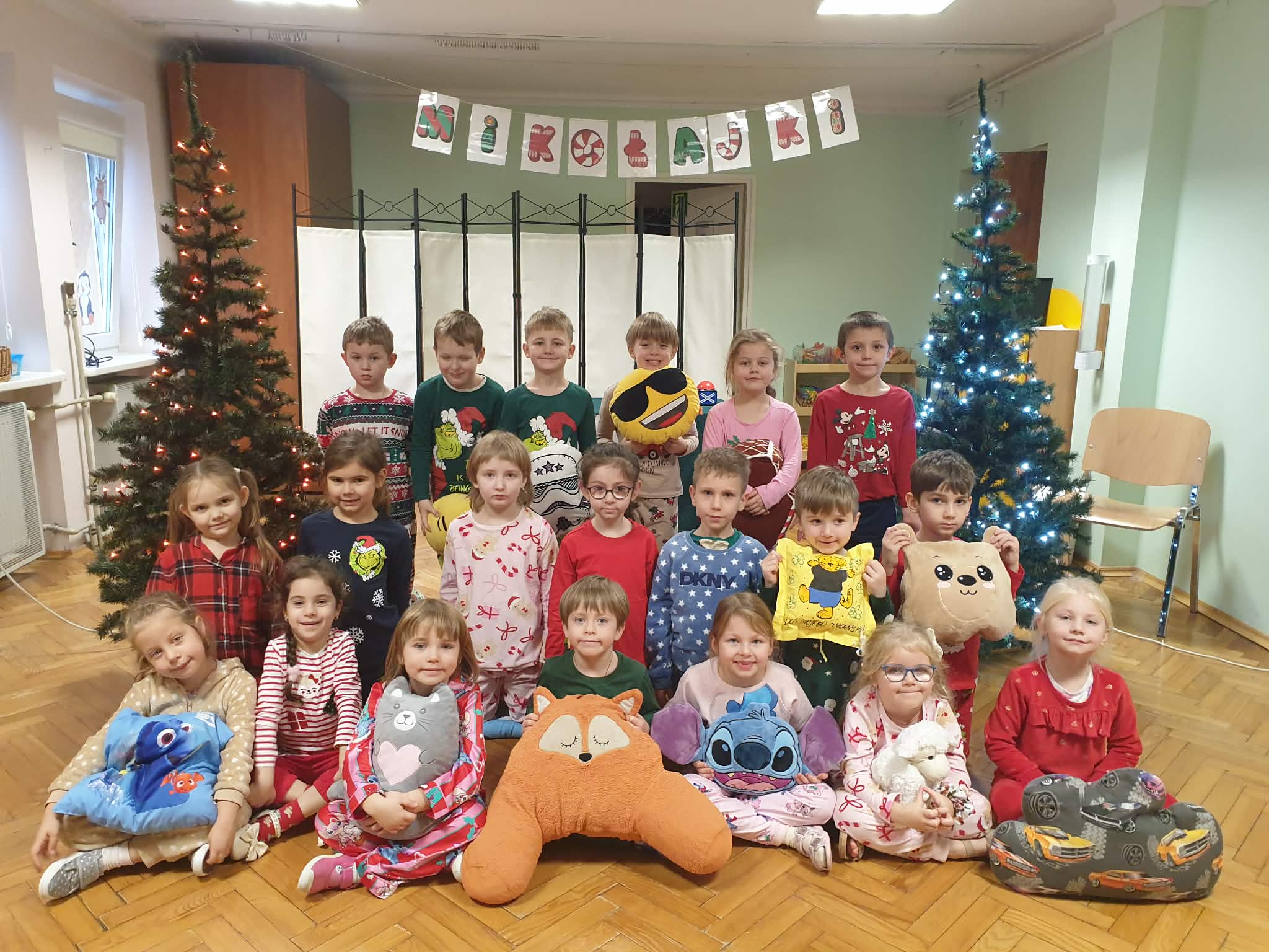 W naszej grupie i grupie V odbyły się w piątek (05.12.2025r.) wyjątkowe Mikołajki w formie radosnego piżama party. Dzieci przyszły do przedszkola w swoich ulubionych świątecznych piżamkach, przynosząc miękkie poduszki, które tworzyły przytulną, świąteczną atmosferę. Wspólne tańce wywołały mnóstwo śmiechu i energii, a muzyka szybko porwała wszystkich do zabawy. Dużym wydarzeniem był również podczas którego dzieci dumnie prezentowały swoje kolorowe stroje- piżamy. Nie zabrakło także kreatywnych zabaw ruchowych i integracyjnych, które umiliły ten wyjątkowy dzień. Piżamkowe Mikołajki przyniosły nam wiele radości i niezapomnianych wrażeń. To była naprawdę magiczna i pełna uśmiechów chwila w naszym przedszkolu!