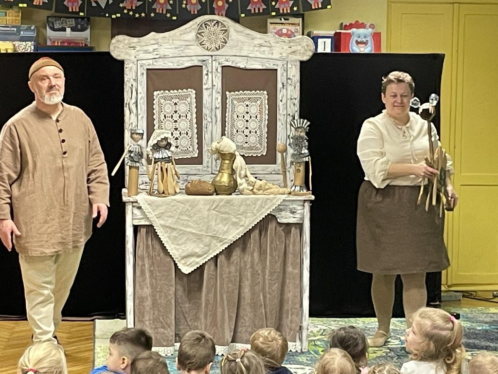 Dnia 02.03.2026r.w naszym przedszkolu odbył się niezwykły spektakl w konwencji teatru przedmiotu. Profesor Hilary Szczebrzeszyński wraz ze swoją roztargnioną asystentką zabrali nas w świat legendy o Złotej Kaczce oraz opowieści o Grzecznym Rycerzu.