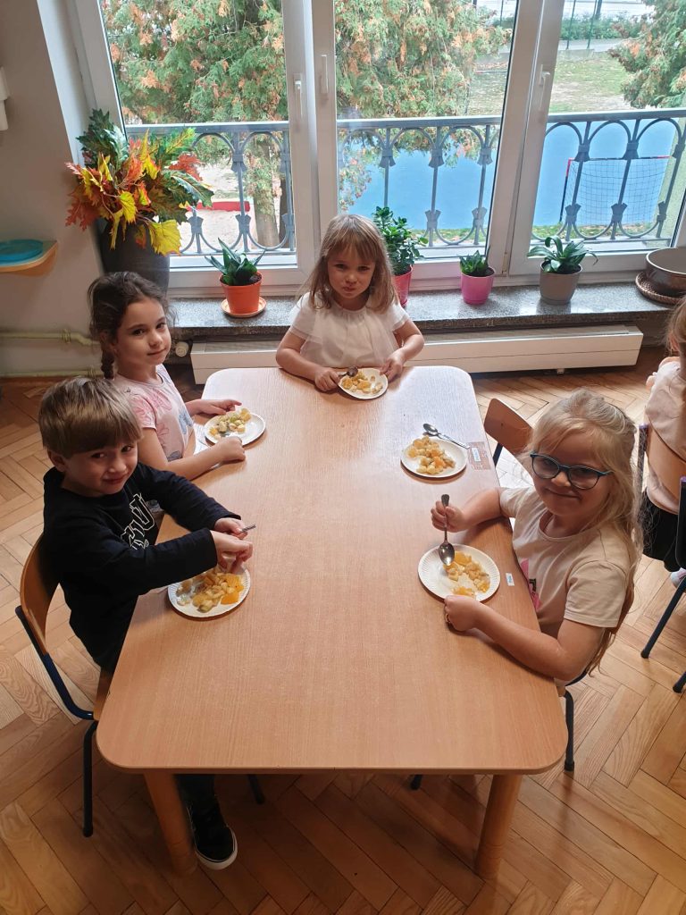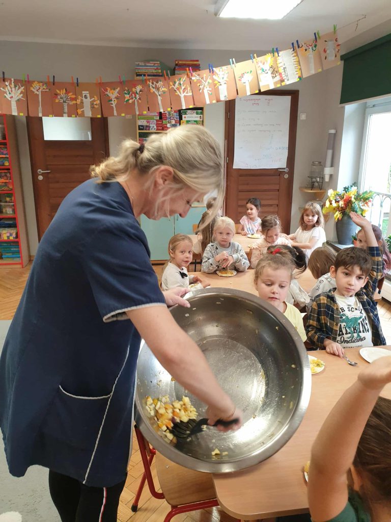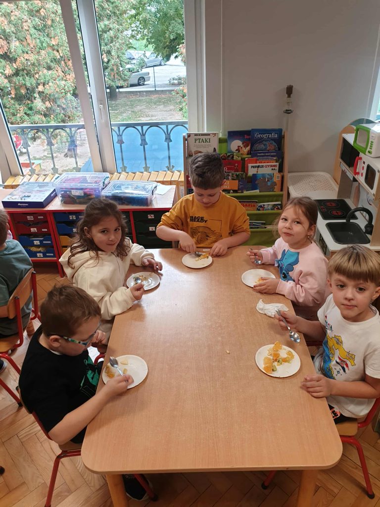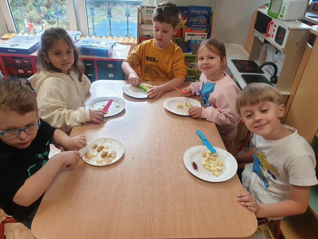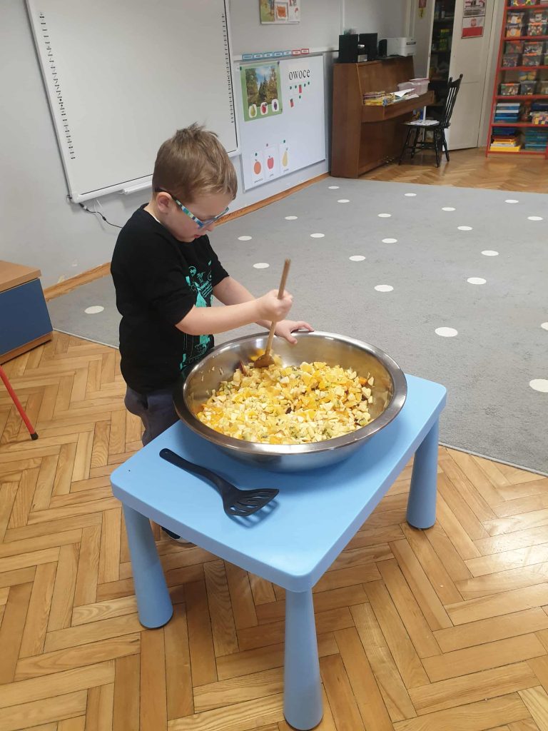 Jesień to sady pełne owoców! Tradycyjne jesienią wzmacniamy naszą odporność poprzez jedzenie owoców w różnej postaci. Dnia 09.10.2025r. postanowiliśmy w naszej grupie zorganizować zajęcia kulinarne, podczas których samodzielnie przygotowaliśmy pyszną sałatkę owocową. Z wielkim zaangażowaniem myliśmy, i kroiliśmy owoce, ucząc się przy tym współpracy oraz zasad zdrowego odżywiania.