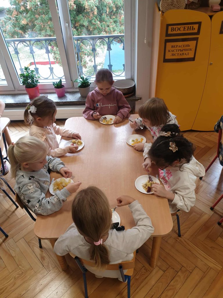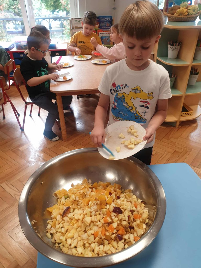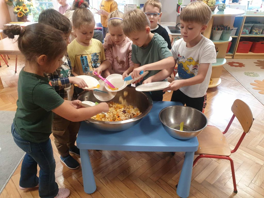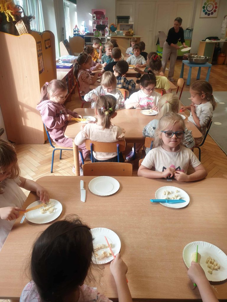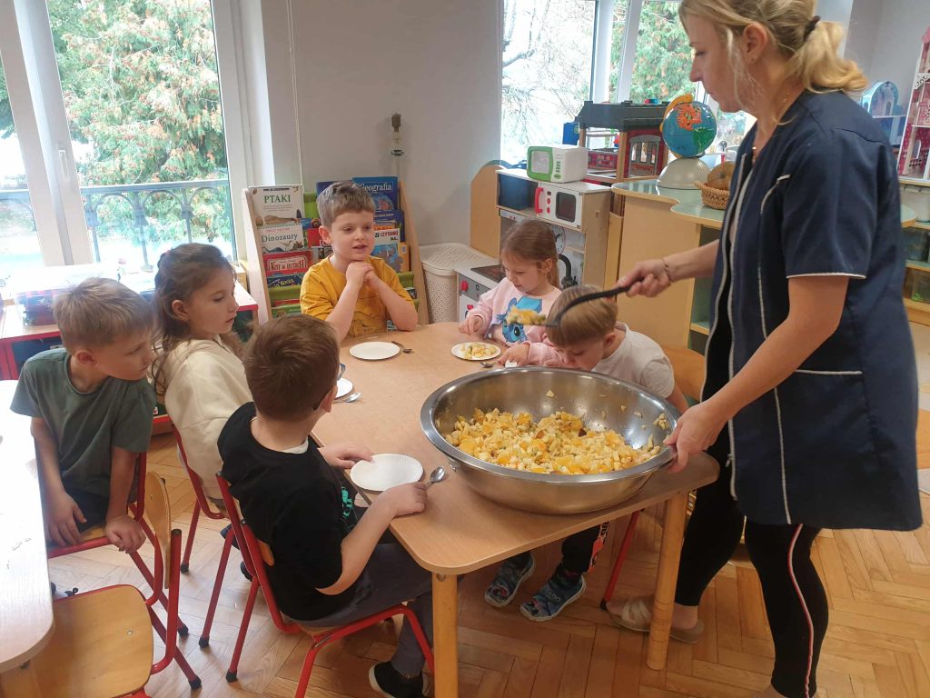 Jesień to sady pełne owoców! Tradycyjne jesienią wzmacniamy naszą odporność poprzez jedzenie owoców w różnej postaci. Dnia 09.10.2025r. postanowiliśmy w naszej grupie zorganizować zajęcia kulinarne, podczas których samodzielnie przygotowaliśmy pyszną sałatkę owocową. Z wielkim zaangażowaniem myliśmy, i kroiliśmy owoce, ucząc się przy tym współpracy oraz zasad zdrowego odżywiania.