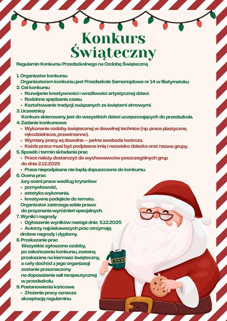 Za nami konkurs plastyczny na wykonanie ozdoby świątecznej zorganizowany przez Rodziców z grupy V. Na konkurs wpłynęły 23 prace. Ozdoby zostały przygotowane przez dzieci i rodziców i przekazane na kiermasz świąteczny, który odbędzie się w godzinach popołudniowych 8 grudnia. Dziękujemy za zaangażowanie i tak liczne zgłoszenia prac. Gratulujemy wygranych!