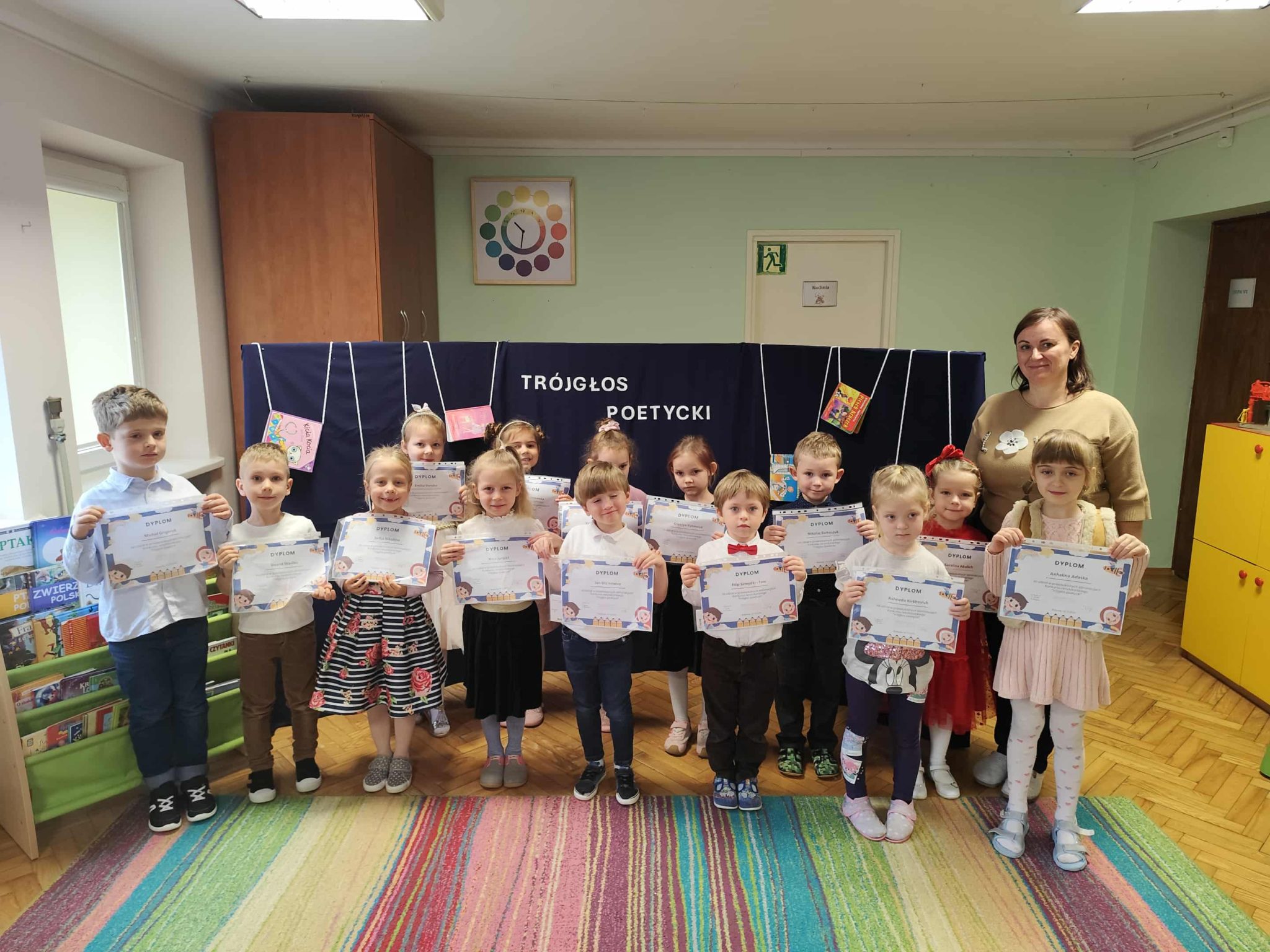 Dnia 16.10.2025r. odbyły się eliminacje przedszkolne konkursu recytatorskiego „Trójgłos poetycki”. W zmaganiach konkursowych wzięły udział dzieci z grup IV, V oraz VI, która z wielkim zaangażowaniem prezentowała swoje wiersze na scenie.