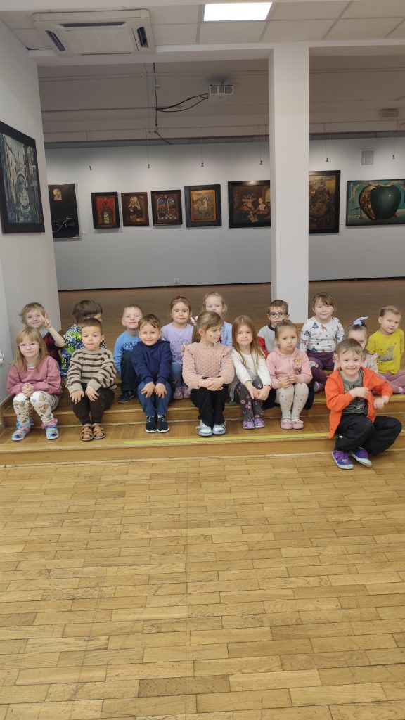 W grudniowy poranek nasze przedszkolaki wybrały się na wyjątkową wyprawę do Galerii Sleńdzińskich w Białymstoku. Celem wizyty było obejrzenie wystawy „Retrospekcja” autorstwa Dymitra Grozdewa. Dzieci z dużą ciekawością odkrywały barwny świat sztuki – przyglądały się obrazom, rozmawiały o kolorach, kształtach i o tym, co widzą na poszczególnych pracach. Wspólnie zastanawialiśmy się, co mogło inspirować artystę i jakie emocje kryją się w jego dziełach.