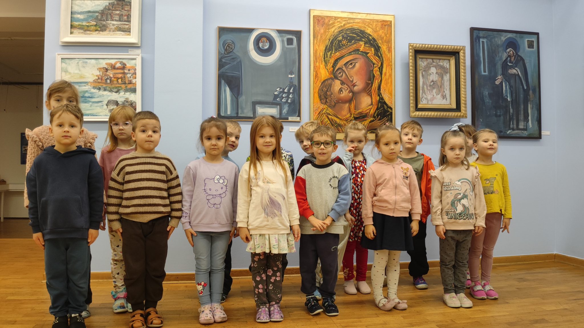W grudniowy poranek nasze przedszkolaki wybrały się na wyjątkową wyprawę do Galerii Sleńdzińskich w Białymstoku. Celem wizyty było obejrzenie wystawy „Retrospekcja” autorstwa Dymitra Grozdewa. Dzieci z dużą ciekawością odkrywały barwny świat sztuki – przyglądały się obrazom, rozmawiały o kolorach, kształtach i o tym, co widzą na poszczególnych pracach. Wspólnie zastanawialiśmy się, co mogło inspirować artystę i jakie emocje kryją się w jego dziełach.