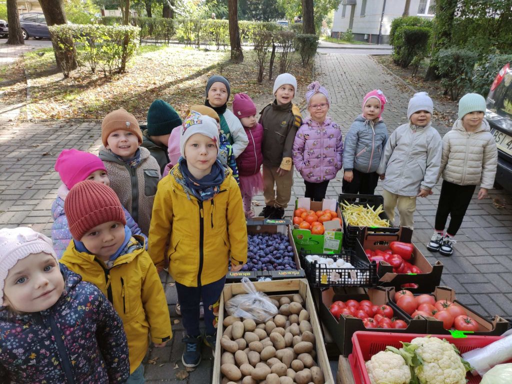 z wizytą do pobliskiego warzywniaka. Celem wycieczki było przede wszystkim utrwalenie nazw owoców i warzyw oraz odpowiednie i kulturalne zachowanie się w miejscu publicznym. Przedszkolaki miały okazję obserwować pracę ekspedientki podczas własnych zakupów.