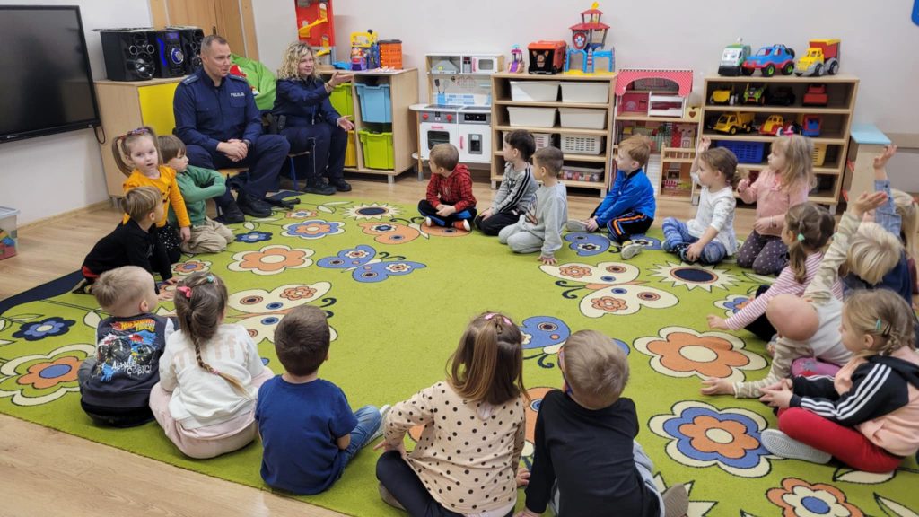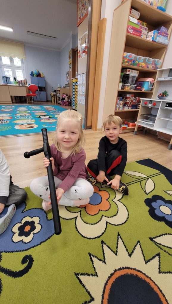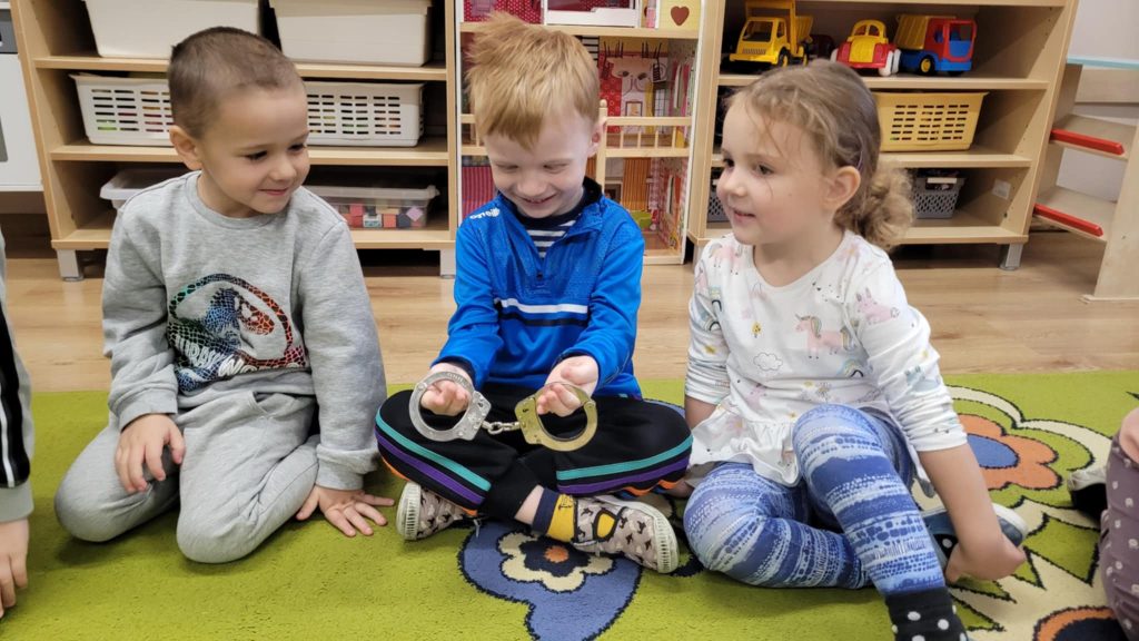 Do naszej grupy zawitali Policjanci z I Komisariatu. Państwo policjanci przypomnieli podstawowe zasady zachowania się podczas przechodzenia przez jezdnię. Następnie wytłumaczyli, jak należy zachować się w kontaktach z obcymi osobami, jak dbać o bezpieczeństwo własne oraz do kogo zwracać się o pomoc w sytuacjach zagrożenia.
