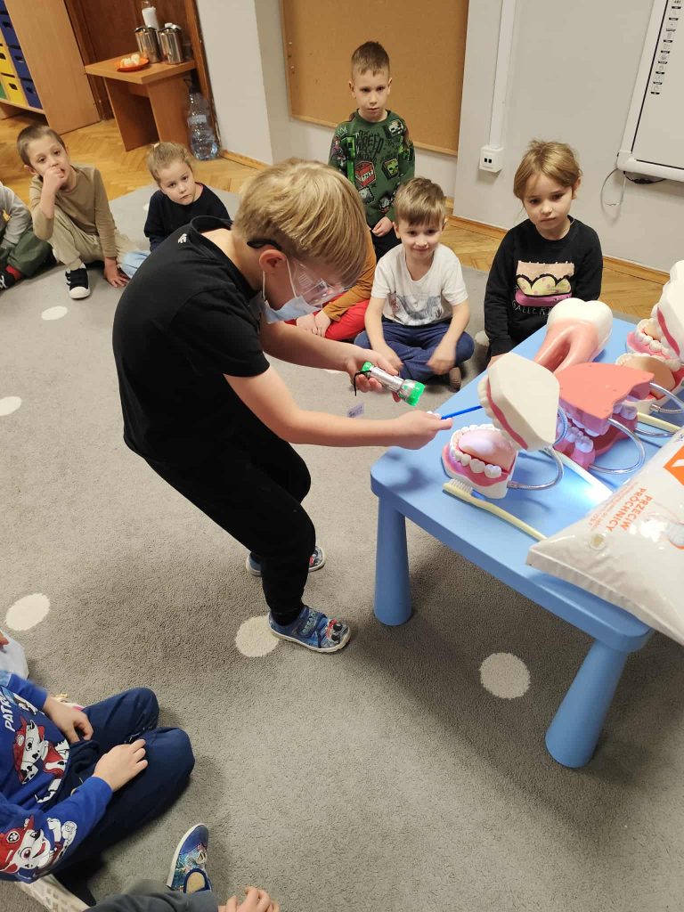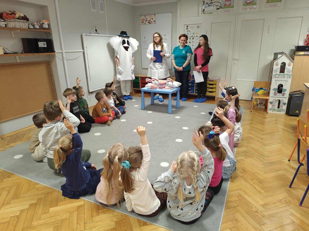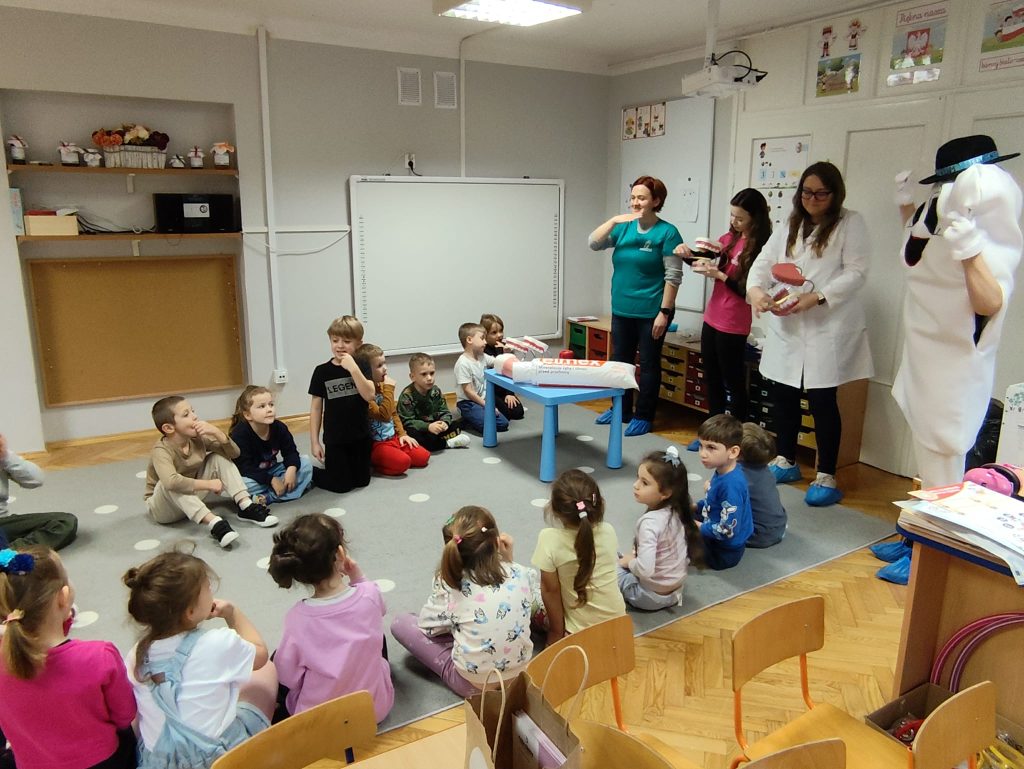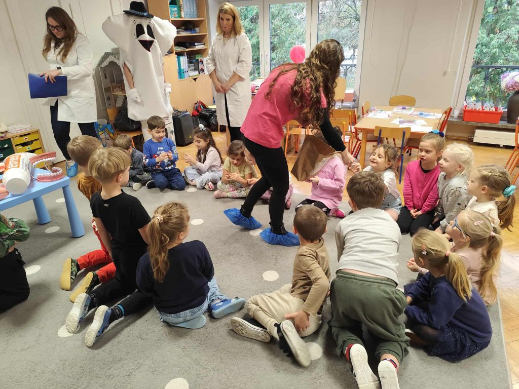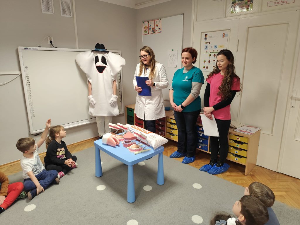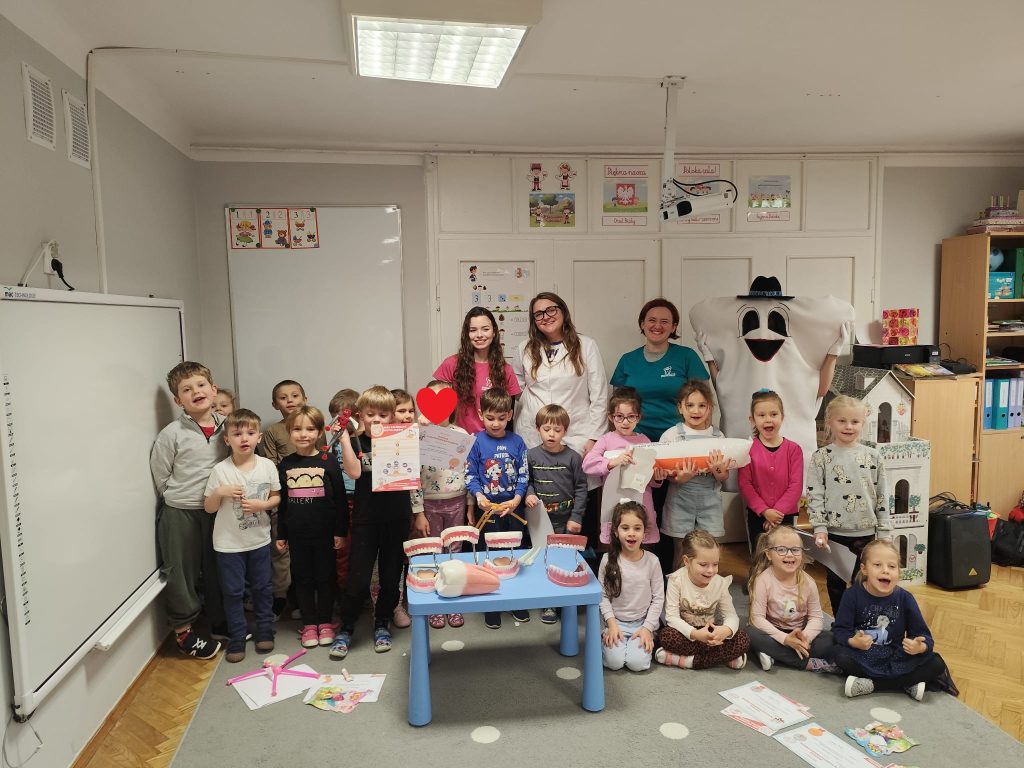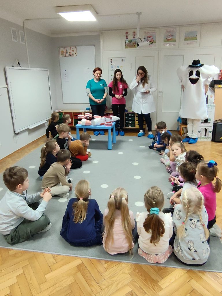 14 listopada 2025 r. naszymi gośćmi byli pracownicy „EduCentrum” Policealnej Szkoły Medycznej w Białymstoku. Przedszkolaki z ogromnym zaciekawieniem wysłuchały pogadanki na temat właściwej higieny jamy ustnej. Dowiedziały się co to jest próchnica, dlaczego psują się zęby w jaki sposób i ile czasu należy je czyścić. Dużym zainteresowaniem cieszył się model szczęki, na którym dzieci według wskazówek Pani higienistki ćwiczyły prawidłowe szczotkowanie zębów. Panie przypomniały również dzieciom o potrzebie wizyt kontrolnych u stomatologa, a także o konieczności właściwego odżywiania się.