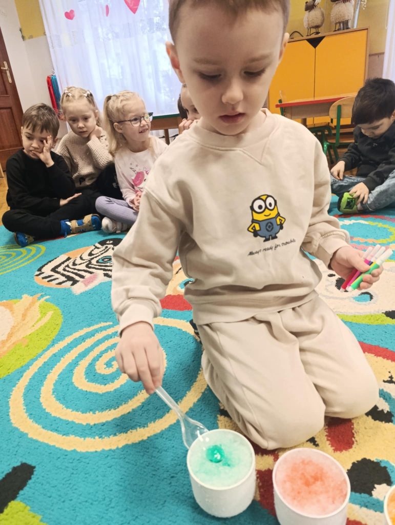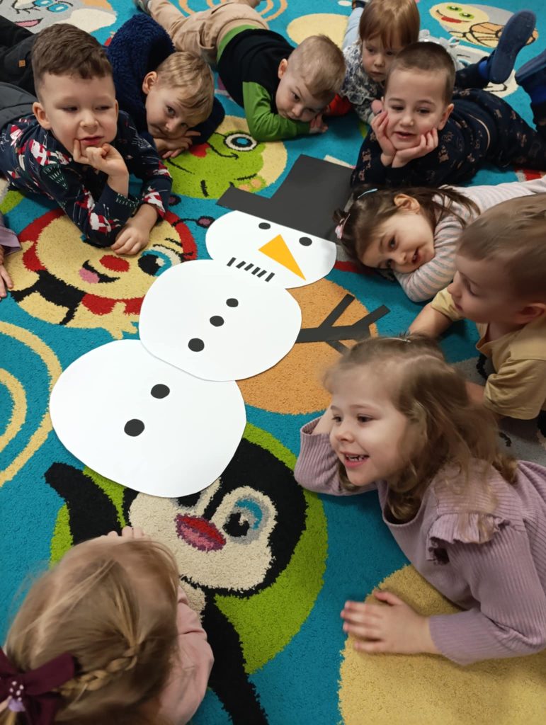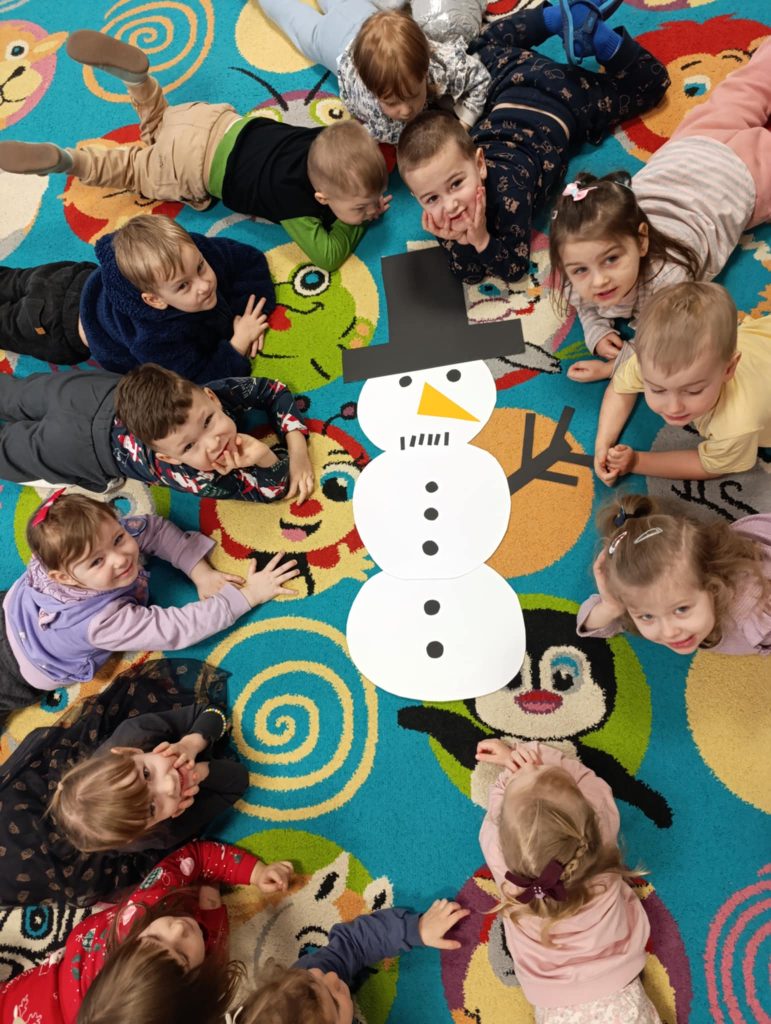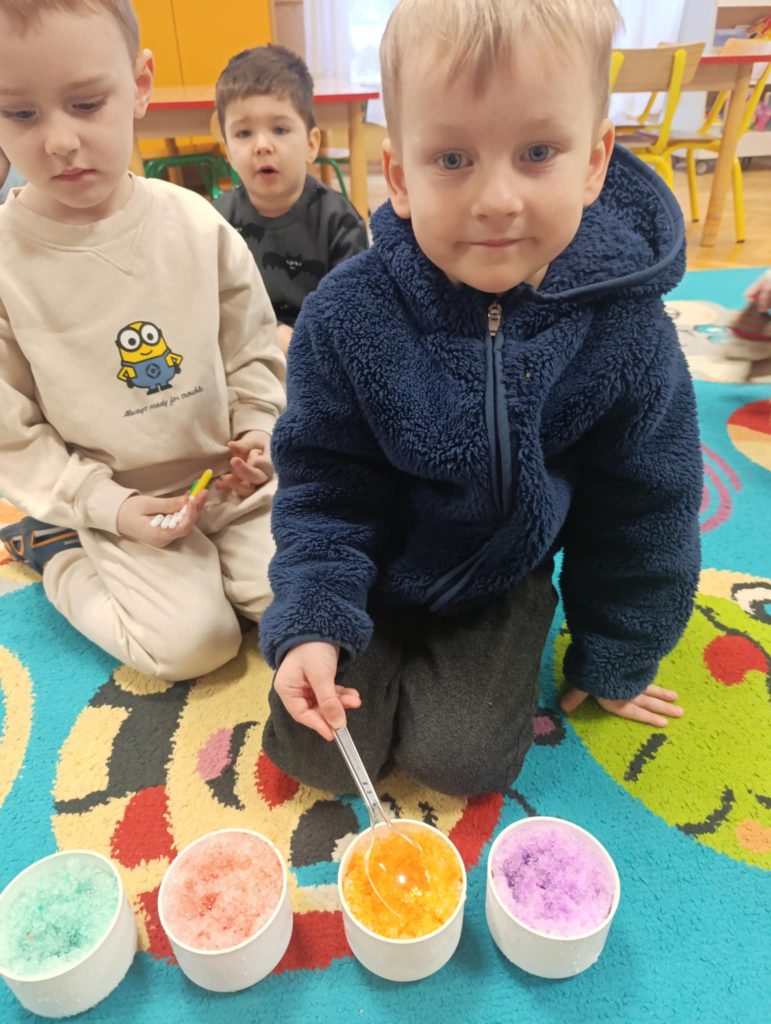 Podczas zimowych zajęć w naszym przedszkolu dzieci z radością tworzyły bałwanka i wspólnie go ozdabiały. Wielką atrakcją było farbowanie śniegu na różne kolory i obserwowanie, jak pięknie się zmienia. Nie zabrakło też wesołych zabaw z chustą animacyjną, które dostarczyły wszystkim dużo śmiechu. To był dzień pełen zimowej radości i wspaniałej zabawy!