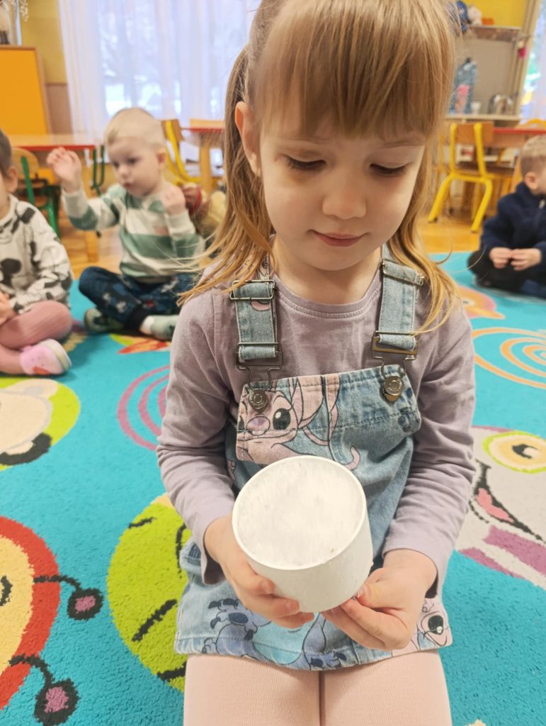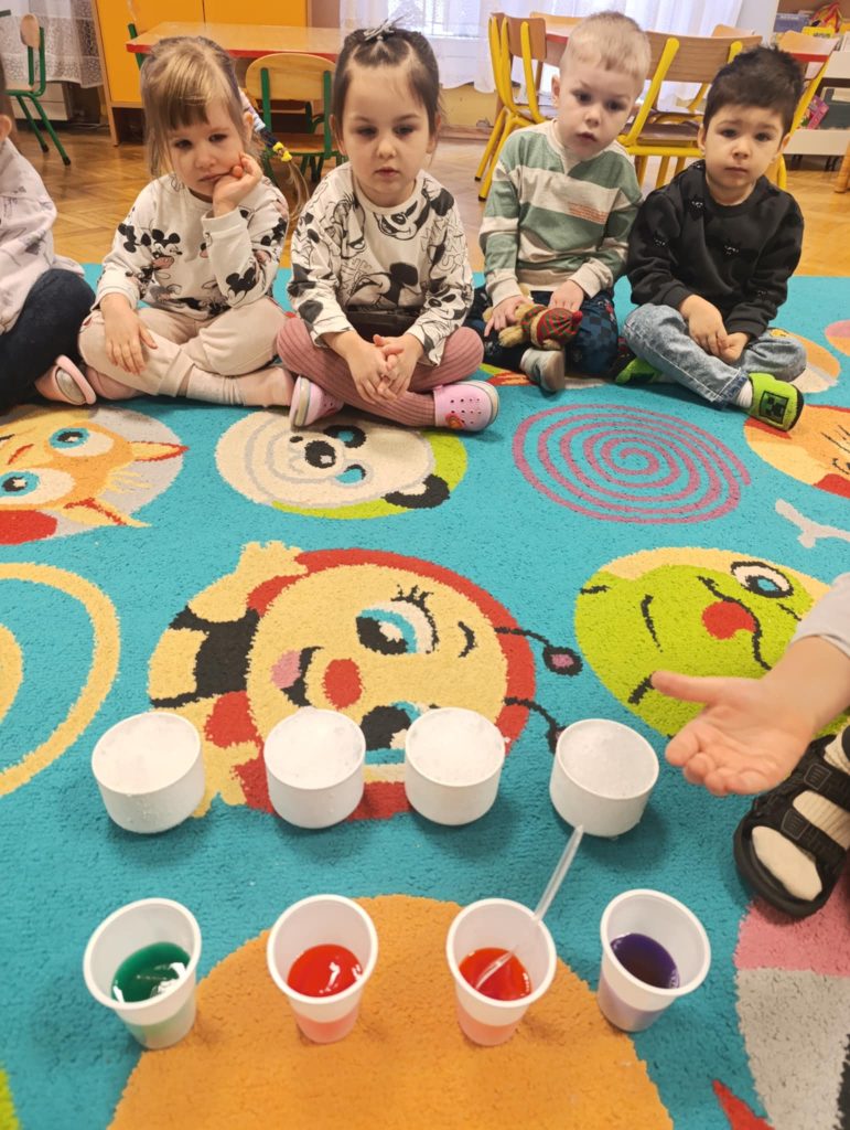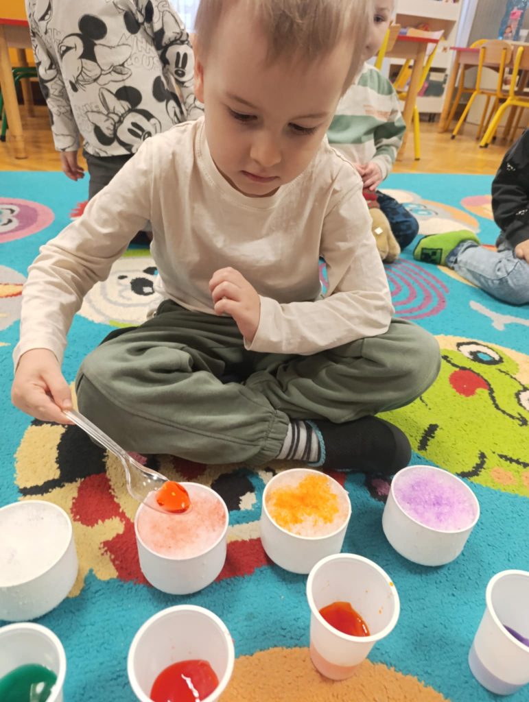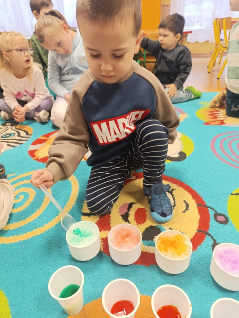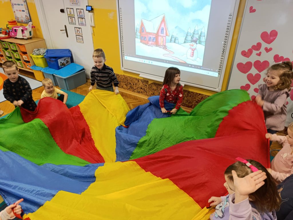 Podczas zimowych zajęć w naszym przedszkolu dzieci z radością tworzyły bałwanka i wspólnie go ozdabiały. Wielką atrakcją było farbowanie śniegu na różne kolory i obserwowanie, jak pięknie się zmienia. Nie zabrakło też wesołych zabaw z chustą animacyjną, które dostarczyły wszystkim dużo śmiechu. To był dzień pełen zimowej radości i wspaniałej zabawy!